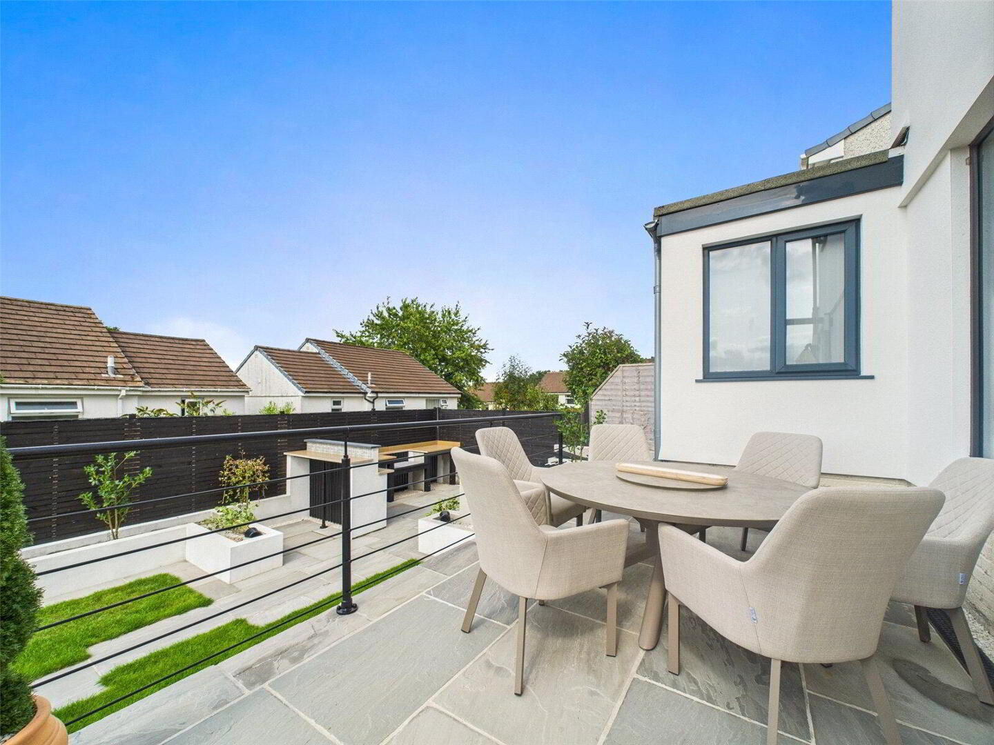Externally, the home is equally appealing. At the front, there is a neatly kept lawn and a driveway providing off-road parking. A side door gives easy access to the side of the property and through to the rear garden. The rear garden itself has been beautifully designed for both relaxation and entertaining, featuring an Indian sandstone patio that provides an ideal spot for outdoor dining. Steps lead down to a level lawn framed by raised flower beds, while a further dedicated outdoor cooking and seating area creates the perfect setting for barbecues, family gatherings, and summer evenings with friends.