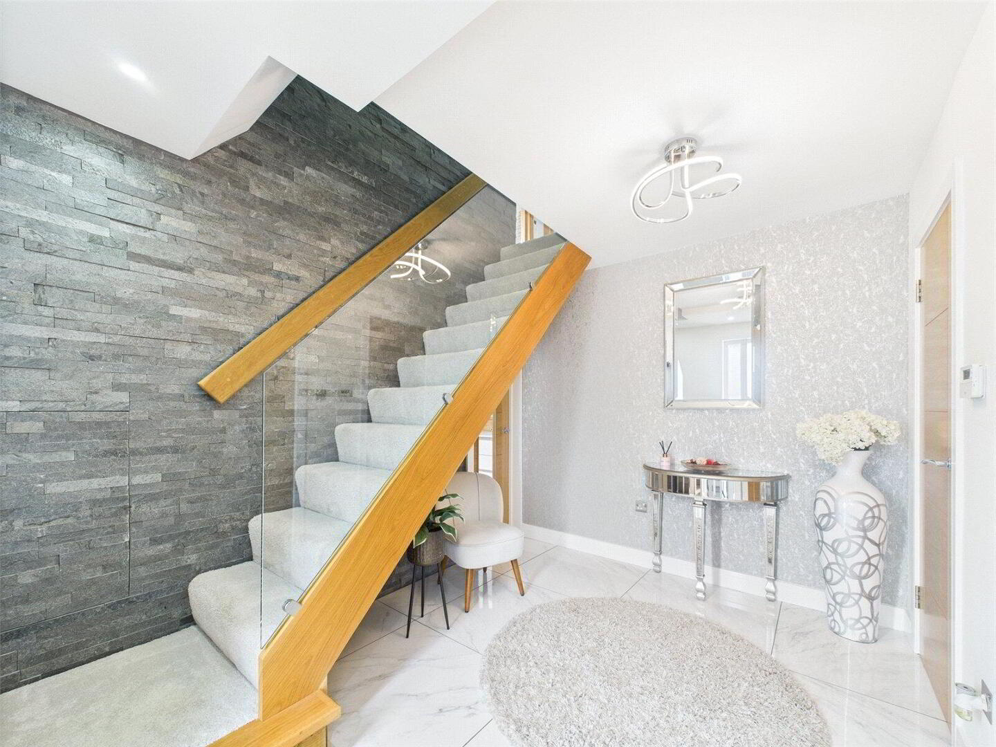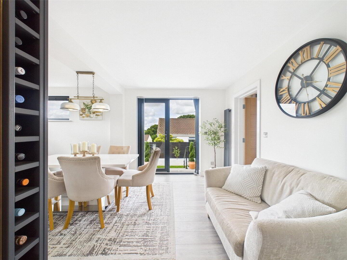 The property welcomes you with a spacious and inviting entrance hall, complete with a cloakroom and generous storage options. From here, you are led into the heart of the home — an impressive extended kitchen/dining area that seamlessly combines practicality with elegance. The kitchen features high-quality fittings and appliances, with ample space for family dining and entertaining. French doors open directly onto the landscaped garden, creating a seamless flow between indoor and outdoor living — perfect for summer gatherings or quiet moments in the fresh air.