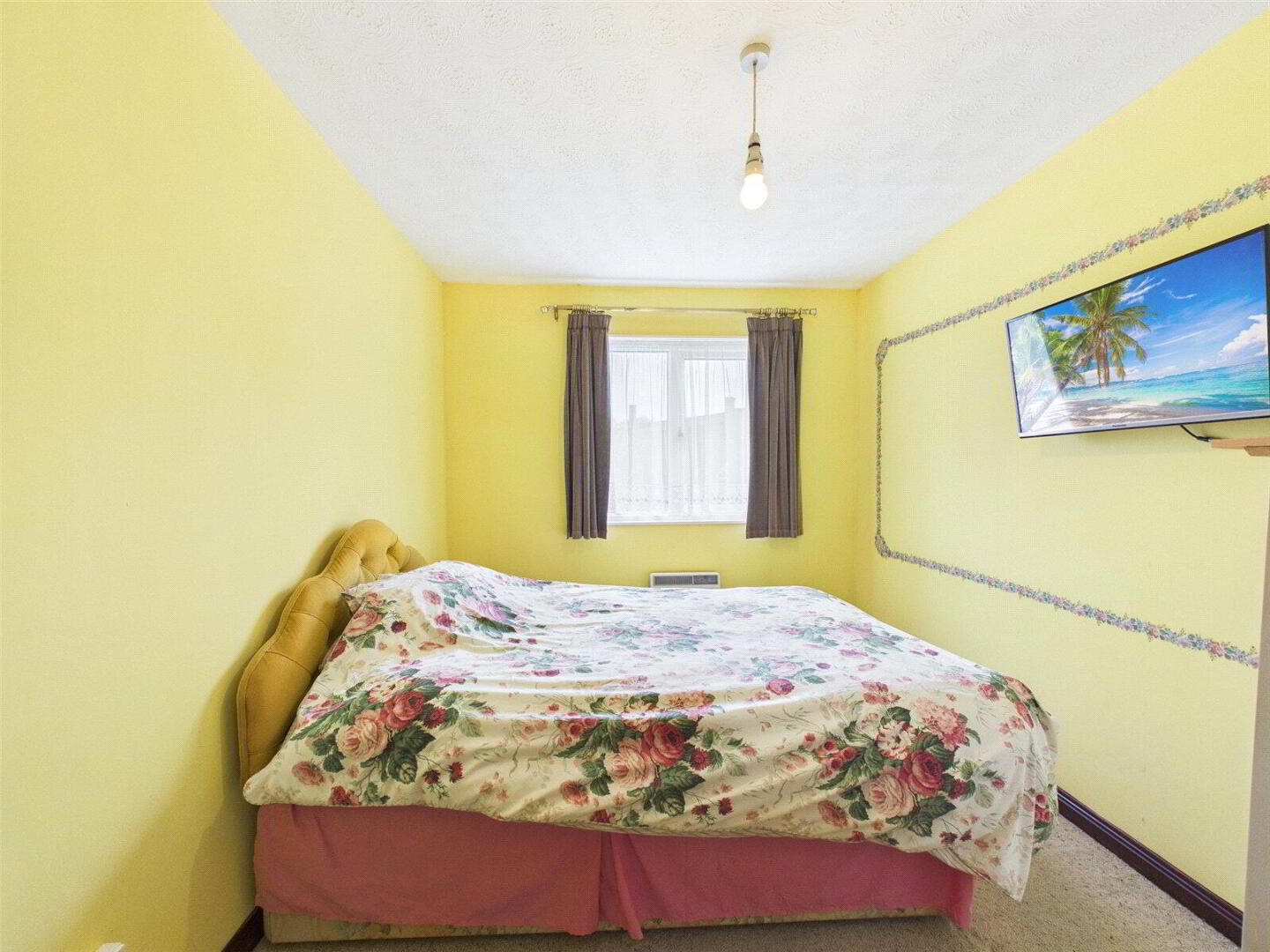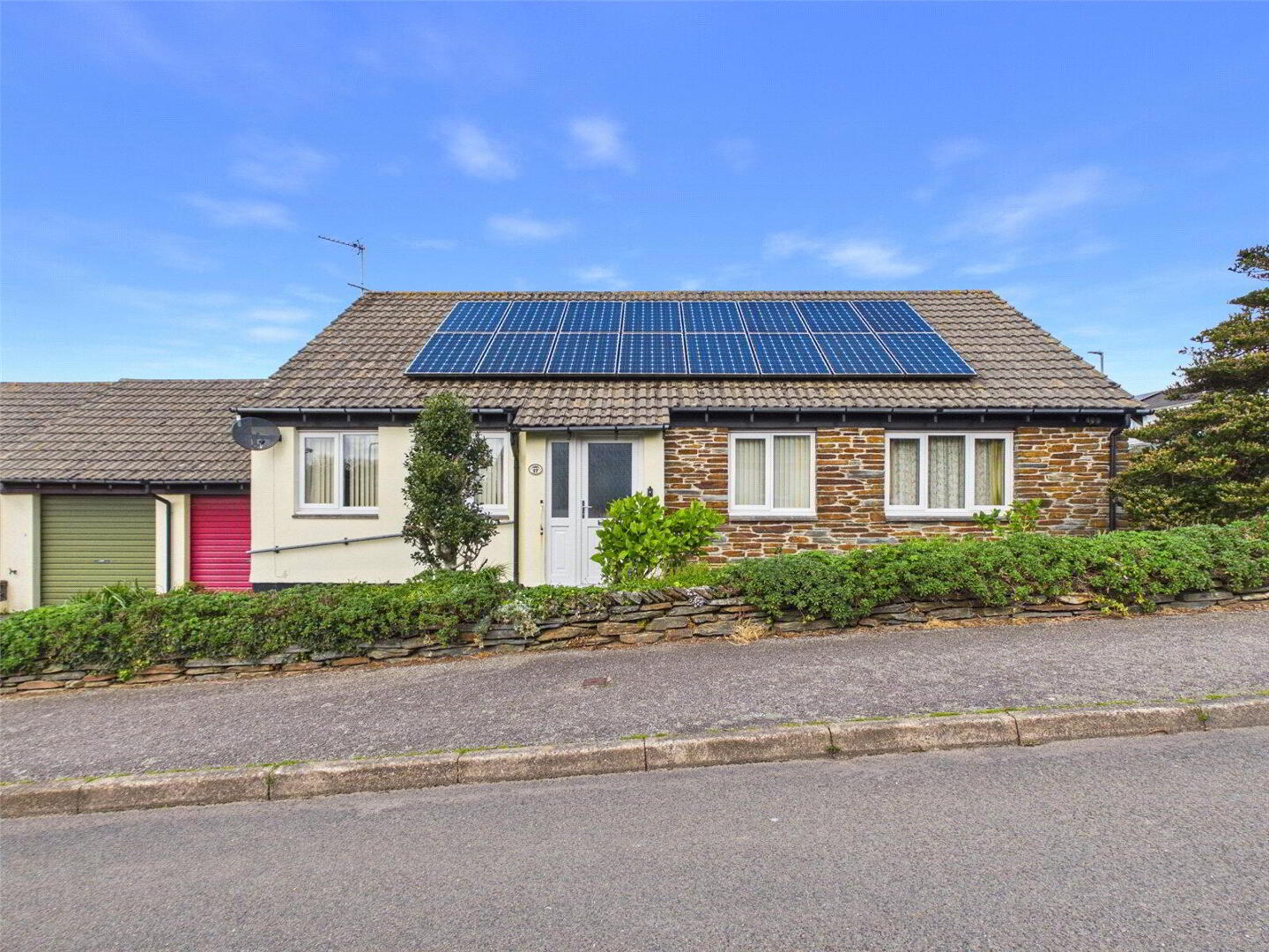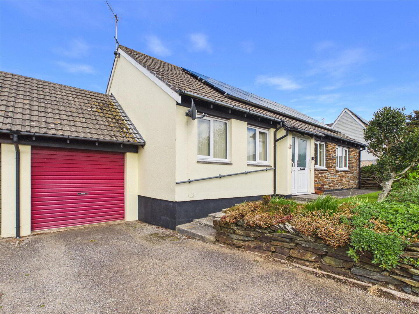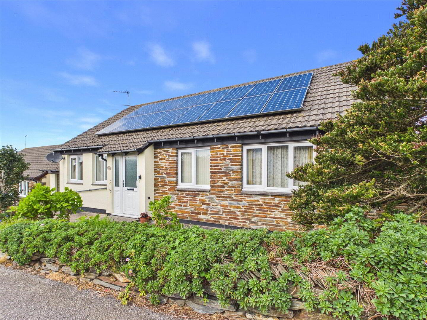 To the front, the property benefits from solar panels, driveway parking for two vehicles, along with a neatly kept lawn and pathway leading to the entrance.