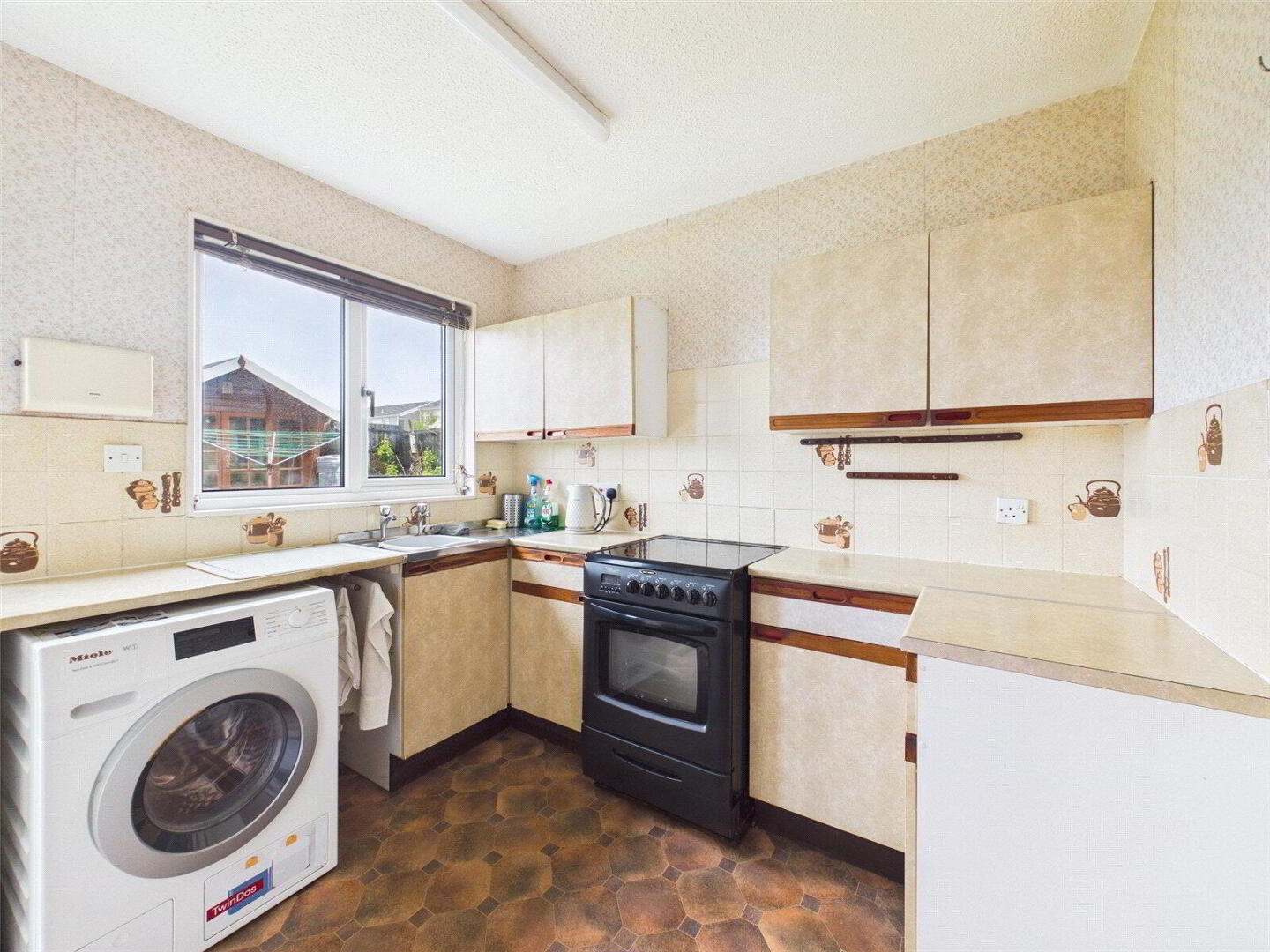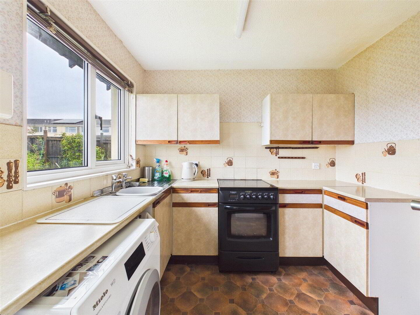 The kitchen is well-appointed with a range of base and wall units, oven and grill, electric hob, sink and space for appliances.