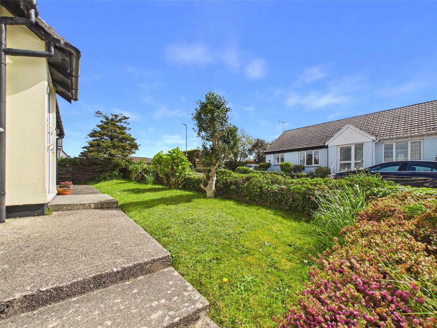 To the front, the property benefits from off-road driveway parking for two vehicles, alongside a neatly maintained lawn and pathway leading to the entrance.