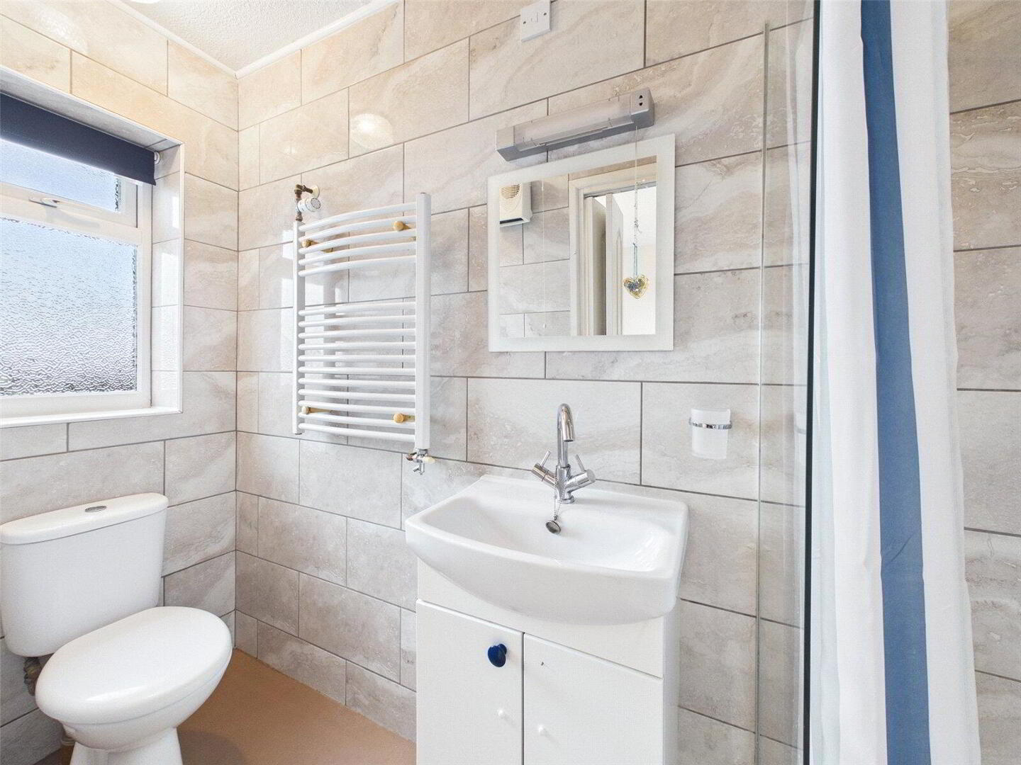 Fitted with a low flush WC, vanity unit with inset wash hand basin, larger shower cubicle with electric "Mira Sport" shower over and heated towel rail. Frosted window to rear elevation. - Bedroom 2