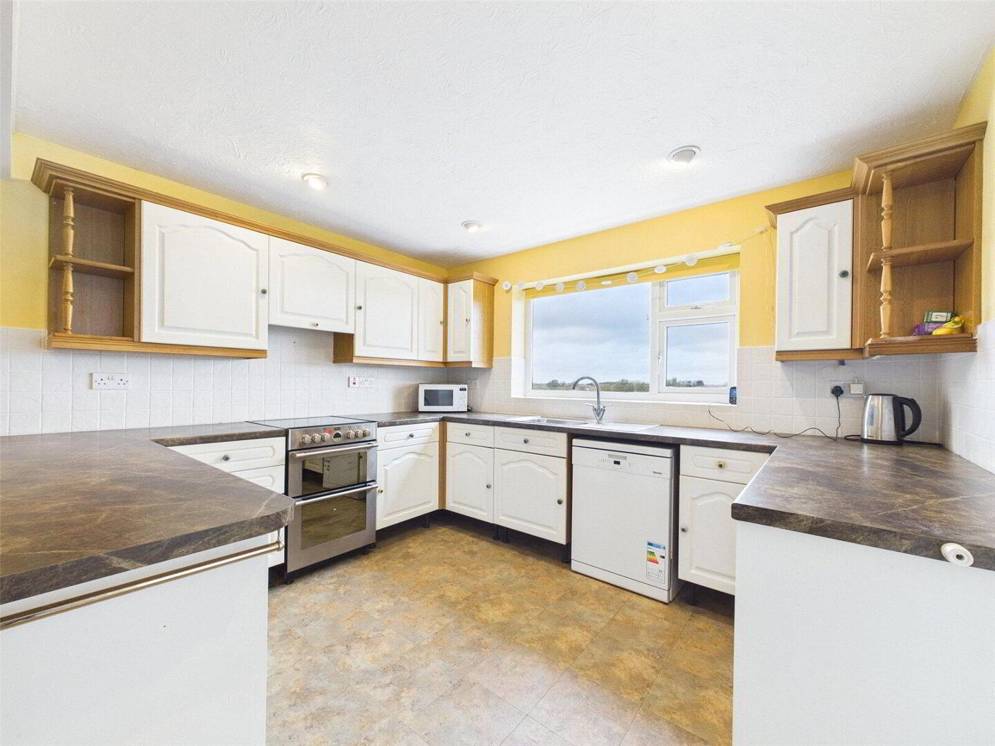 Fitted with a range of wall and base mounted unit with work surfaces over, incorporating a stainless steel sink drainer unit with mixer taps. Space for electric oven with extractor, washing machine, dishwasher and free standing fridge /freezer. Ample room for dining table and chairs. Window to rear elevation overlooking the garden and fields behind. Access to the conservatory and Living room. - Living Room