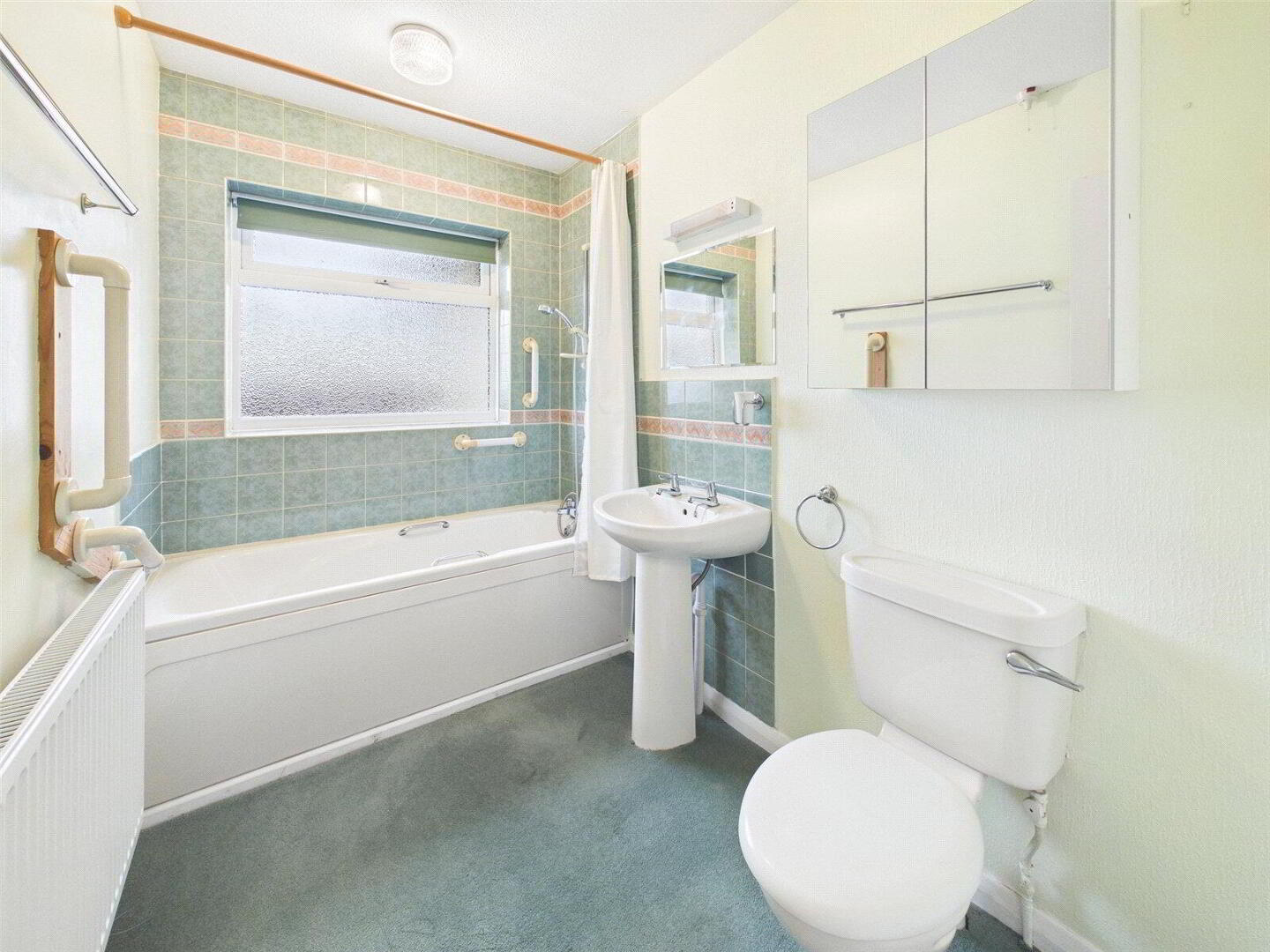A three piece suite comprising panel bath with shower attachment over, pedestal wash hand basin and close coupled WC. Frosted Window to rear elevation. - Outside