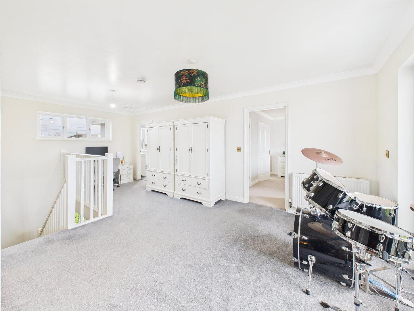 To the first floor, a spacious landing with an additional balcony area provides access to four further well-proportioned bedrooms. The principal bedroom benefits from a walk in wardrobe and an en-suite shower room, while the remaining bedrooms are served by a contemporary family bathroom. The accommodation is well balanced throughout and lends itself equally well to family life, home working, or flexible lifestyle use.