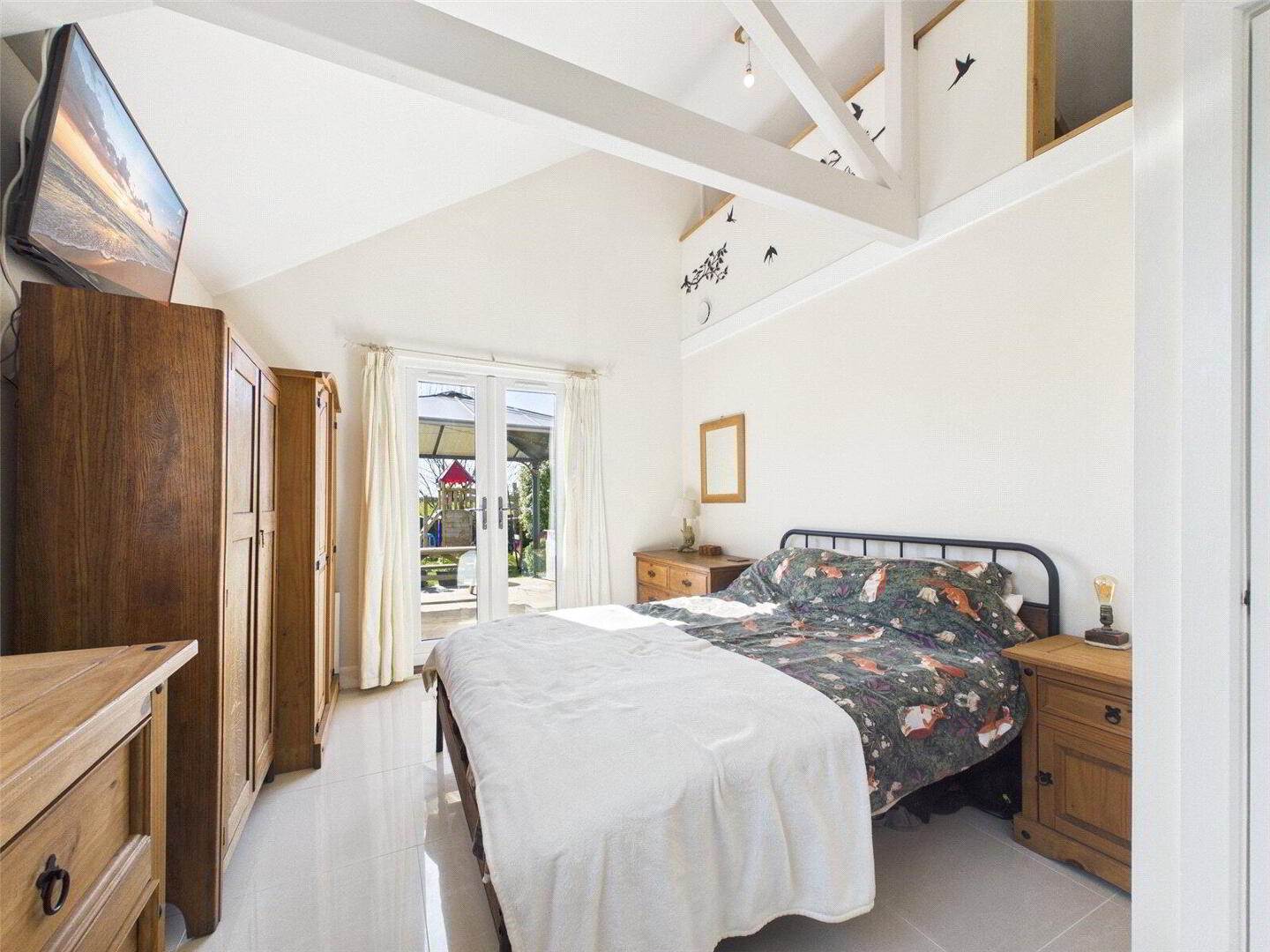 A central hallway leads to the remaining accommodation, including three well-sized bedrooms, a contemporary family bathroom, and an impressive master suite. The principal bedroom benefits from its own vaulted ceiling, a stylish en suite, and French doors that open directly onto the garden, allowing for plenty of natural light and a lovely connection to the outdoor space.