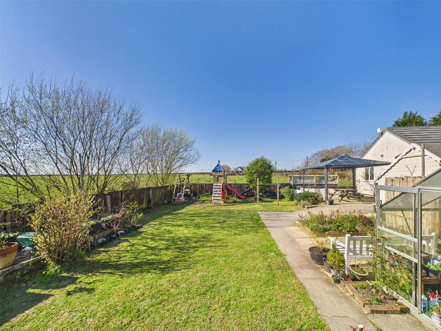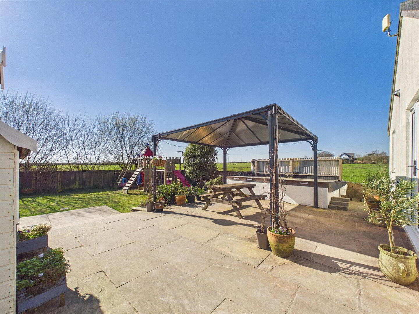 The gardens are predominantly laid to lawn and are beautifully maintained, complemented by well-stocked flower borders, a spacious patio area with pergola—ideal for outdoor dining and entertaining—and additional storage sheds.
