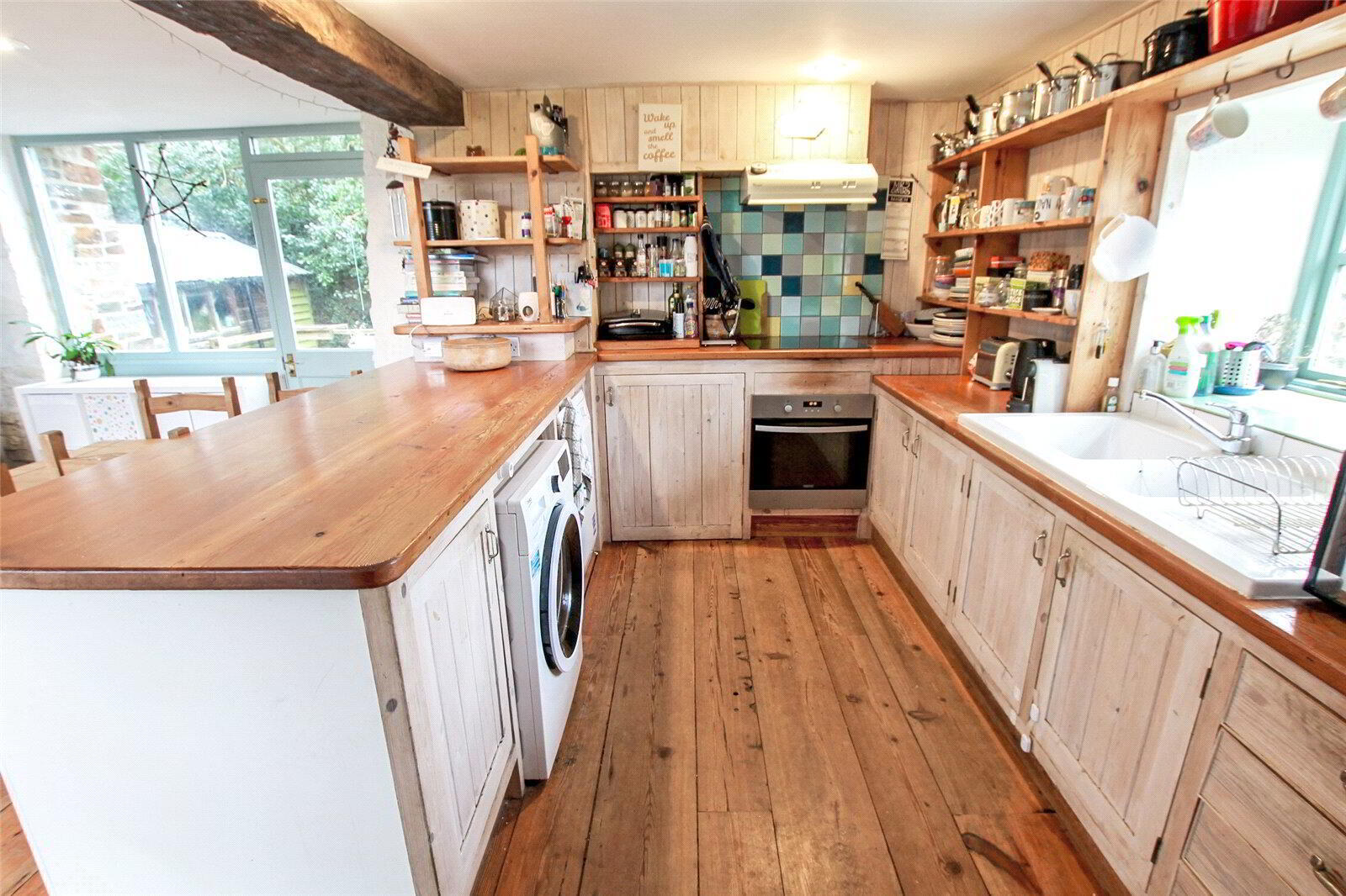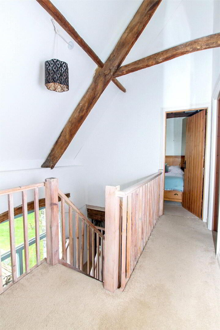 A glazed entrance door with windows either side give access to the open plan ground floor, incorporating an attractive living area with an oil fired stove and fitted shelving. To the opposite end there is a country kitchen, complete with a twin bowl porcelain sink, four ring ceramic hob with an electric oven under as well as space and plumbing for a washing machine/ tumble dryer. On the first floor, the landing has exposed A-frame timbers and a galleried balustrade around the stairs. The master bedroom has a vaulted ceiling, an exposed A-frame timbers and a built in wardrobe. There are two further bedrooms, along with a family bathroom.