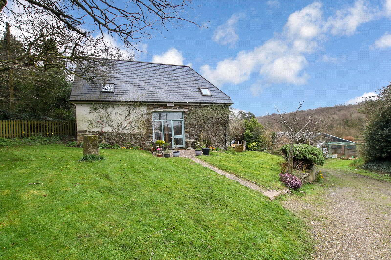 From the lane, a five bar gate gives access to the driveway, providing off road parking for several vehicles. To the front and side of the barn are areas of lawned garden with gravelled patio, a mature tree lined Devon bank gives privacy to the front garden. To the rear is a large gravelled patio area being well secluded with steps up to a raised timber decked patio being a delightful sitting out area. At the bottom of the driveway is a further area of garden, being ideal for landscaping or use as a vegetable garden, pond etc. The gardens themselves are bordered by mature trees, giving peace and seclusion with attractive views across surrounding countryside towards Dartmoor. In all the gardens and grounds total approximately 0.3 of an acre.