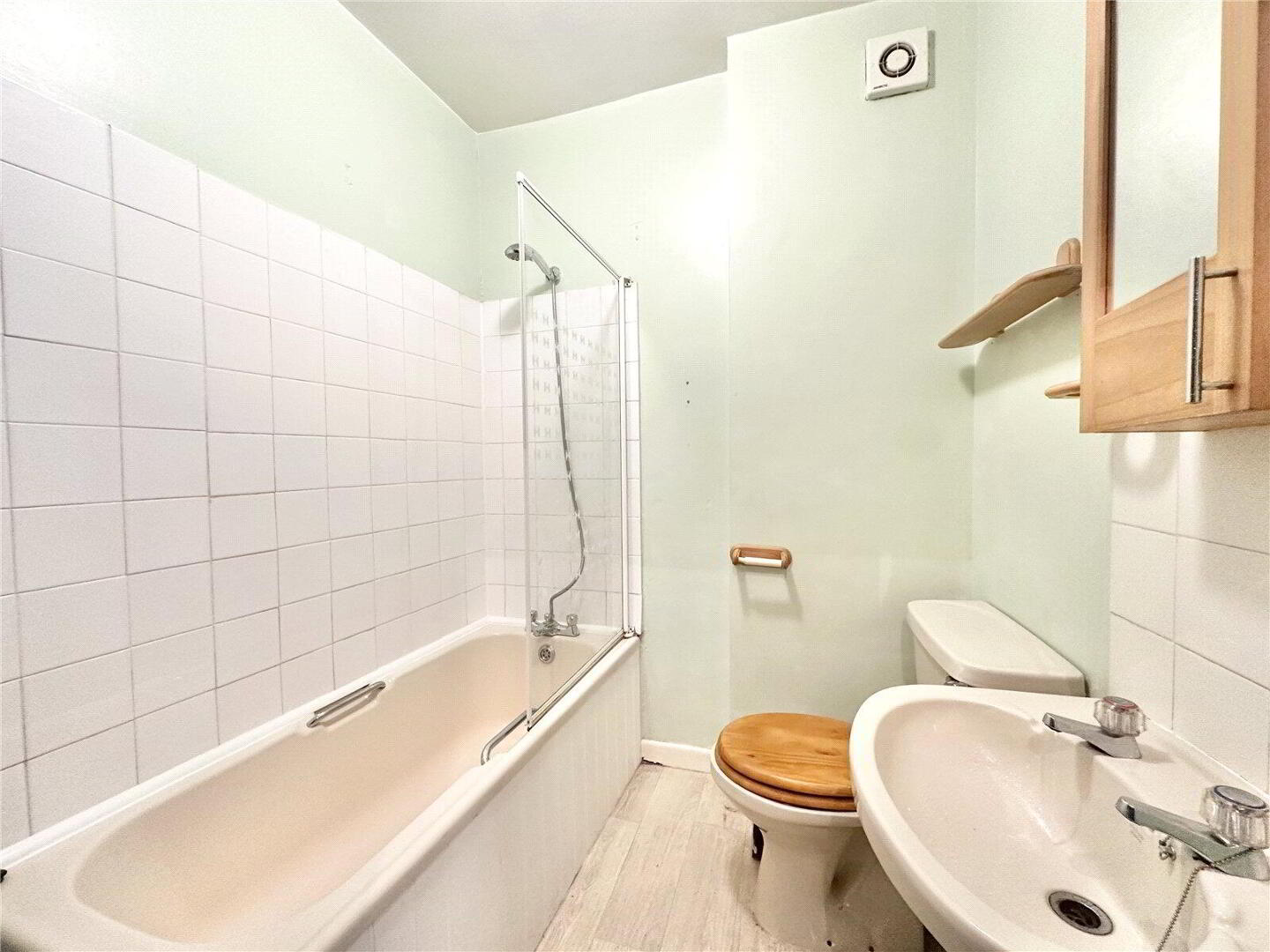 The separate bathroom includes a toilet, sink, and bath with shower over offering both practicality and comfort.