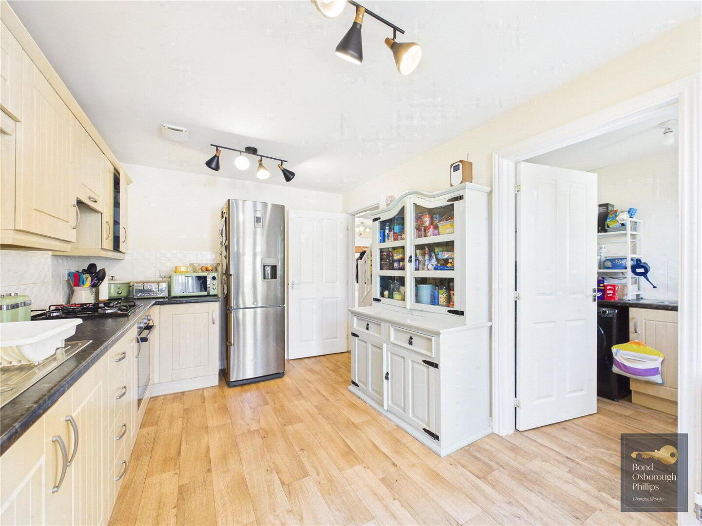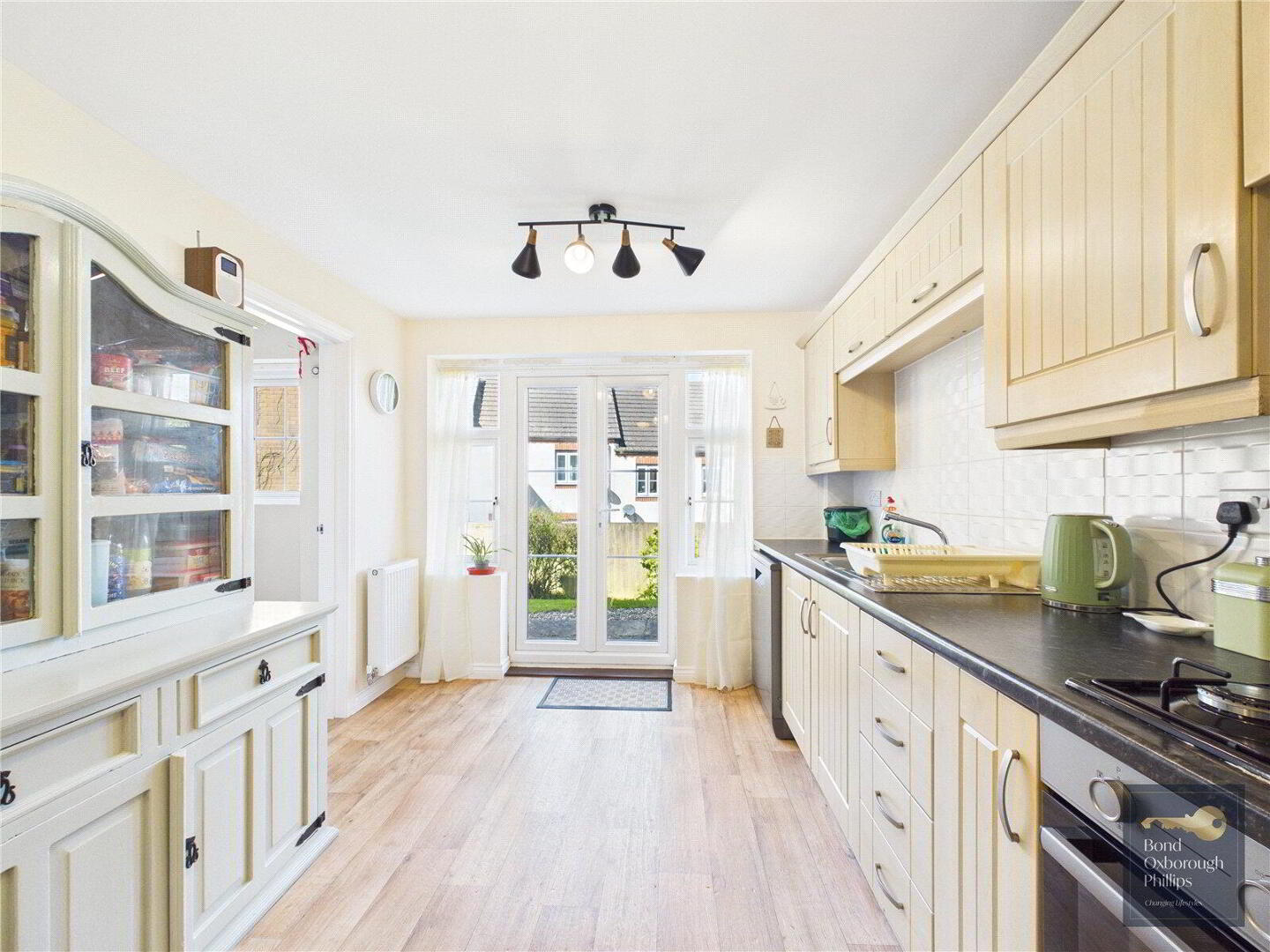 The kitchen is well-proportioned and thoughtfully designed, offering ample cupboard storage and extensive worktop space. It also provides access to the utility room and features double doors leading out to the garden, enhancing the sense of space and practicality.