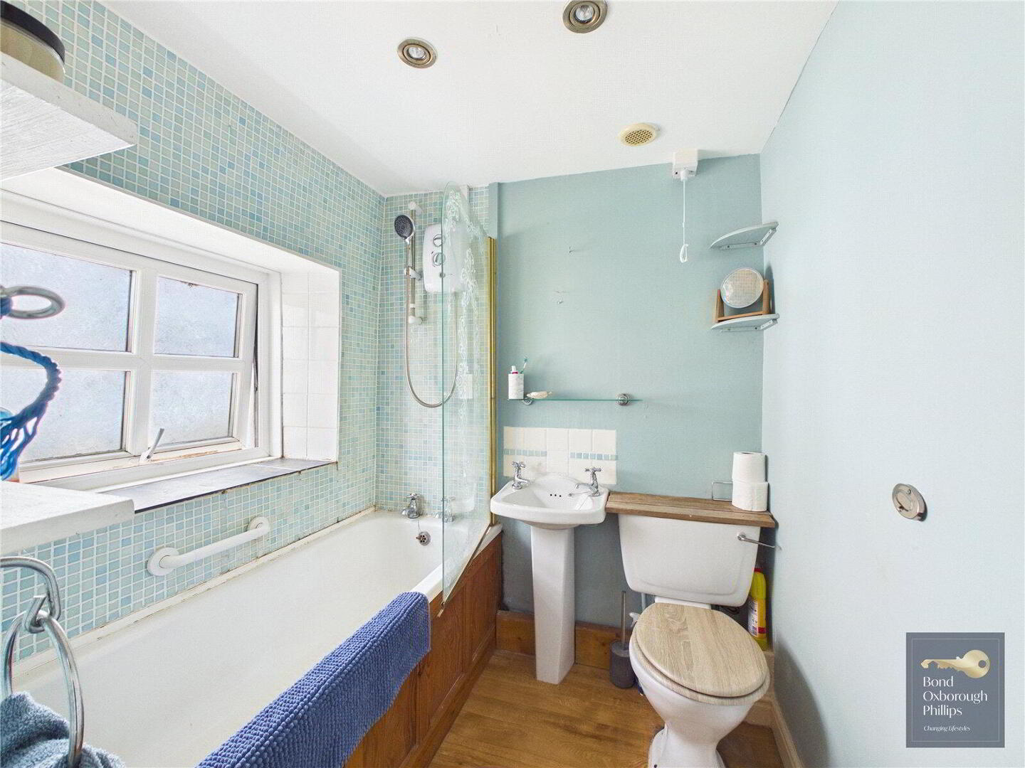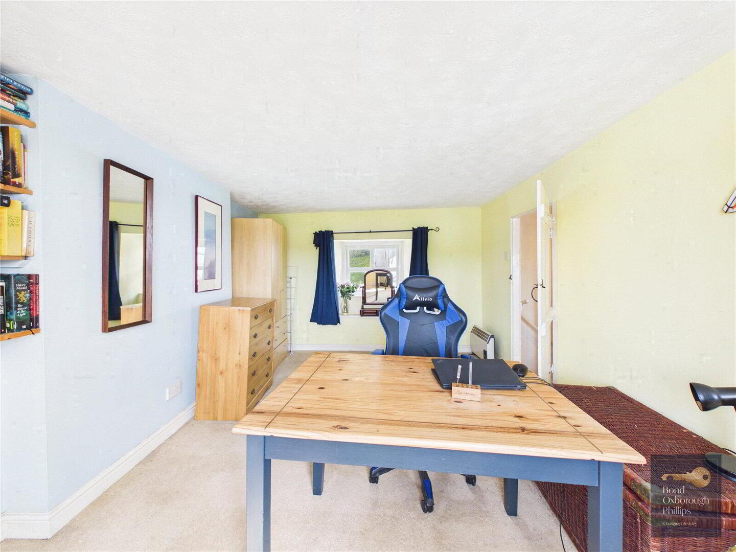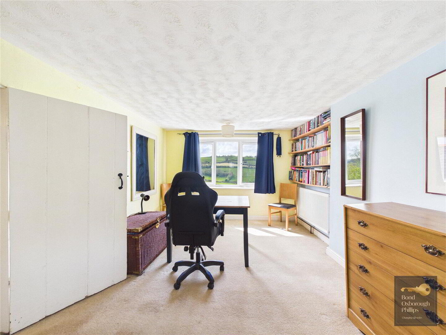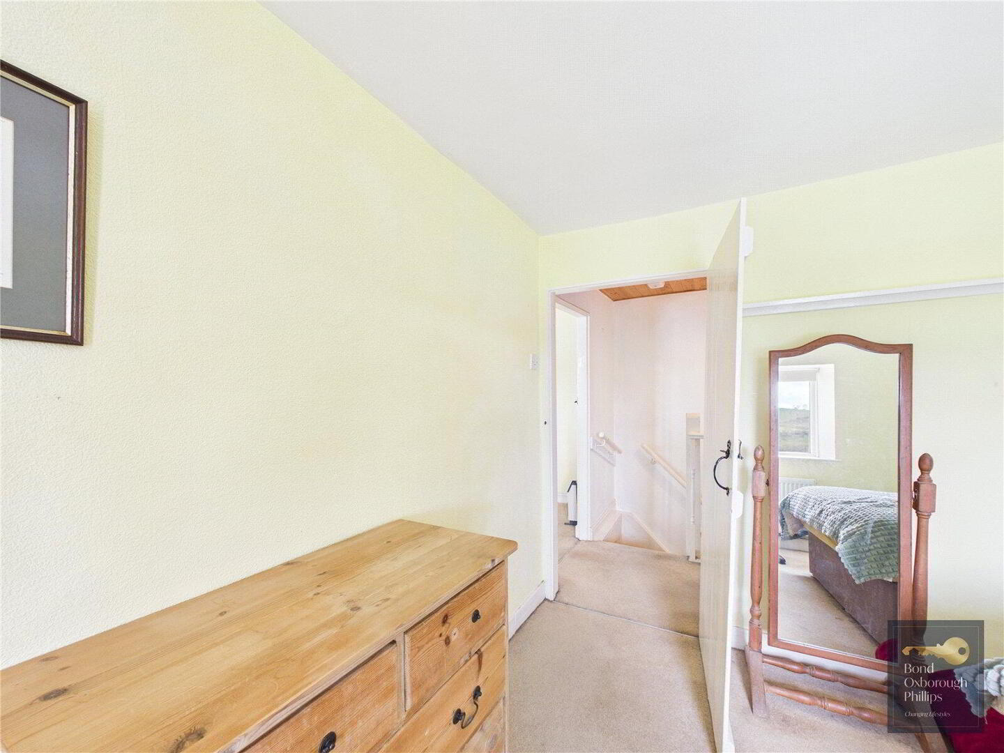 Upstairs, the first floor hosts two generously sized double bedrooms. Both rooms benefit from south-facing windows, ensuring plenty of natural light while also making the most of the far-reaching views across the landscape and garden. The family bathroom is well-appointed, featuring a three-piece suite including a bath with shower over, WC, and wash basin, along with a window for natural ventilation and light.