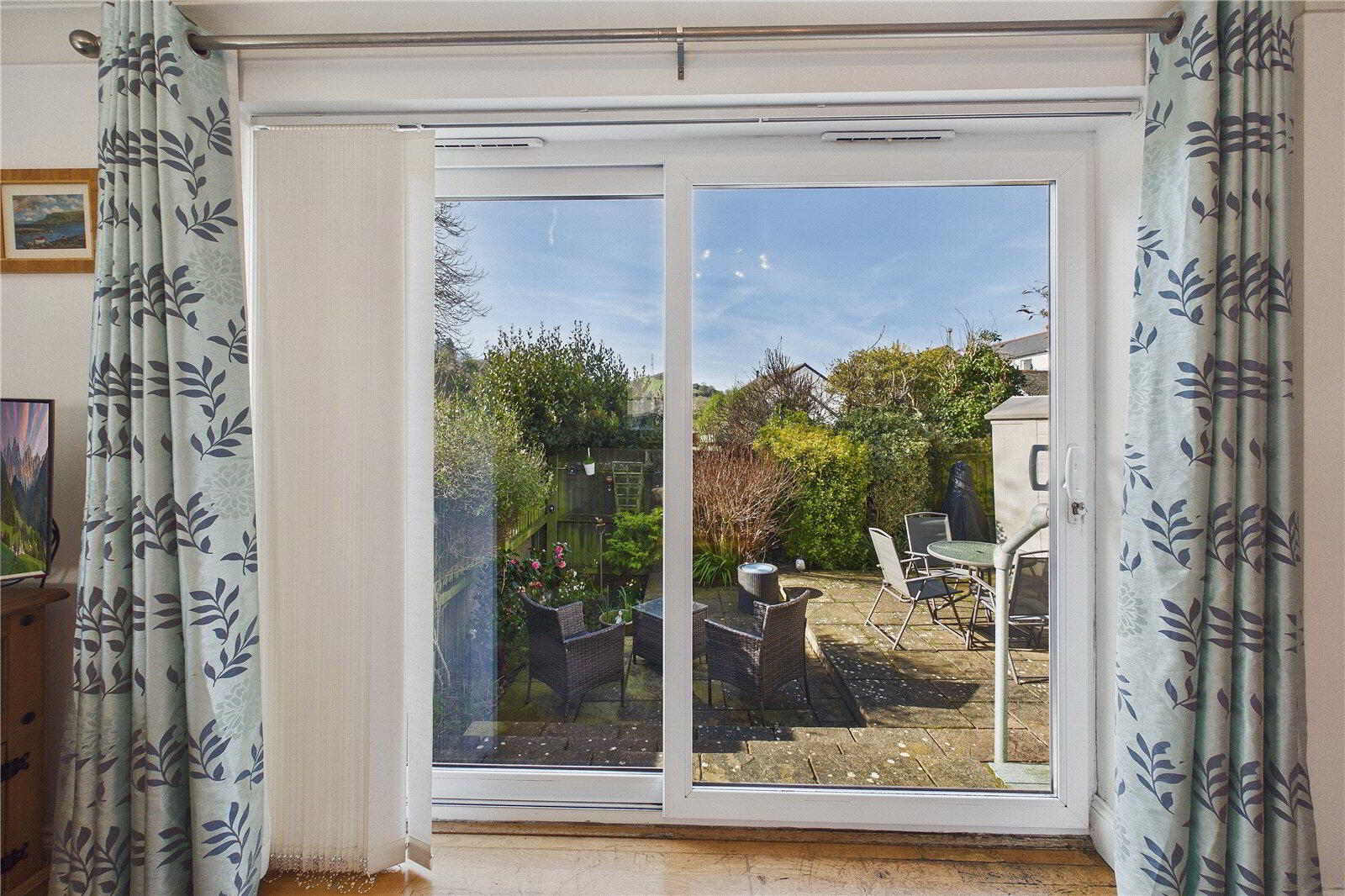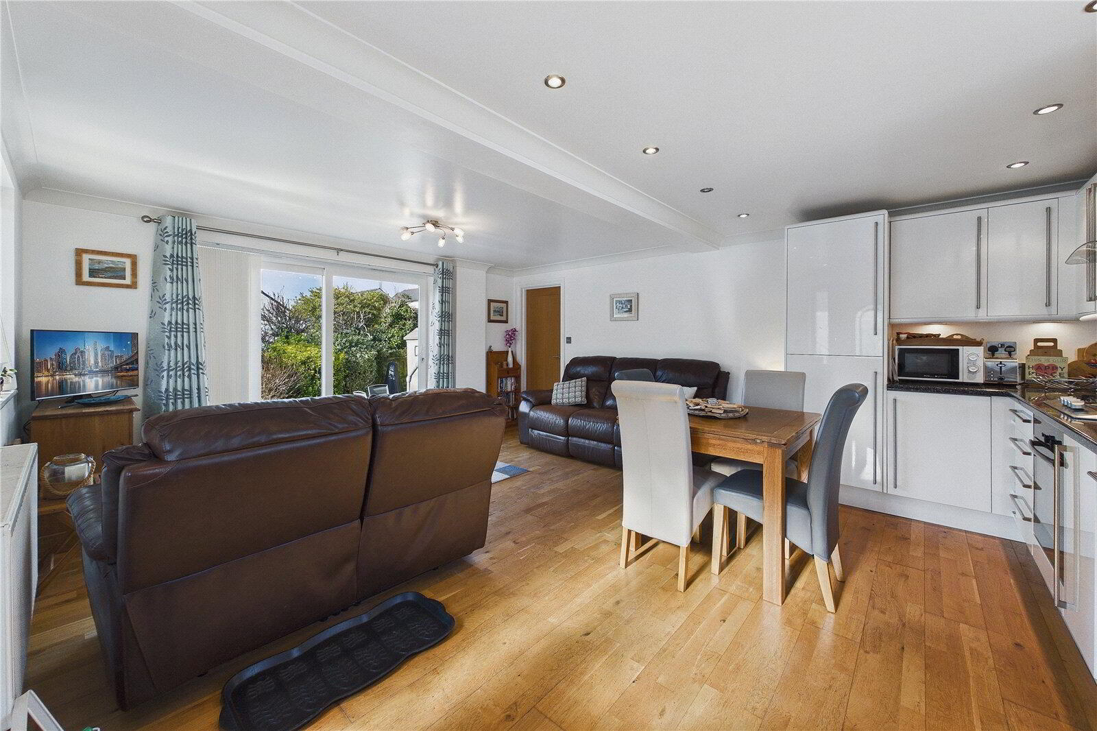 Finished to an excellent standard throughout, the property enjoys a superb sunny aspect and an outstanding outlook, creating a wonderfully light and uplifting atmosphere. The centrepiece of the home is the impressive open-plan kitchen/lounge/diner, a beautifully proportioned and sociable space enhanced by charming exposed wooden floorboards that add warmth and character. Large windows frame the attractive views while allowing natural light to flood the room, and doors open directly onto the garden, providing an effortless flow between indoor and outdoor living — ideal for entertaining or relaxed coastal evenings.