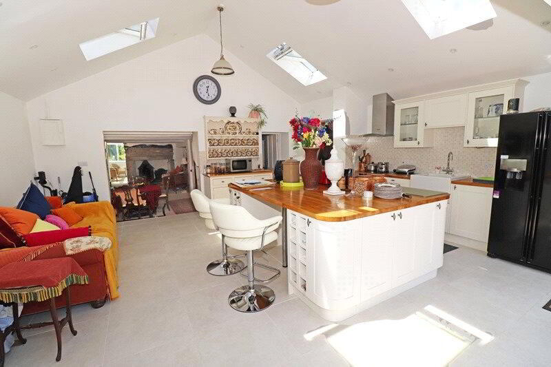 - This stunning addition to the cottage measures 19'9" x 17'5" (6.02m x 5.3m) it comprises ceramic tiled floor with underfloor heating. A central island with solid wood work tops incorporating a Breakfast Bar and wine racks. Further wall and base units with inset ceramic sink. Ceramic hob with oven below and "Hoover" illuminated extractor hood. Glass display cabinets. American fridge freezer. 4 "Velux" roof lights. LED down lighters. Window to side. Oak door to side. Smoke detector. Integrated dishwasher. Stunning bi-fold doors with concealed blinds which run the full length of the kitchen and create a wonderful aspect on to the rear garden.