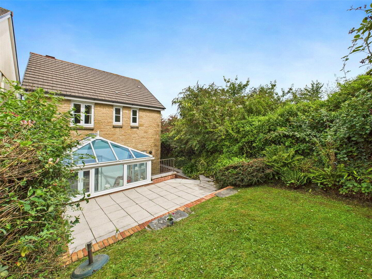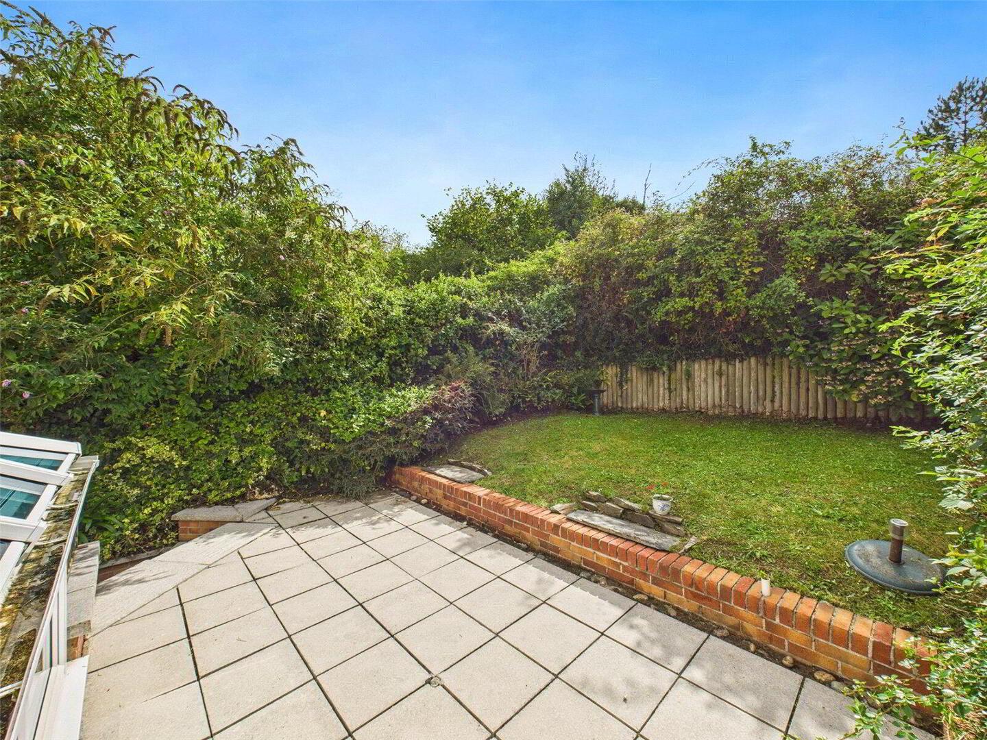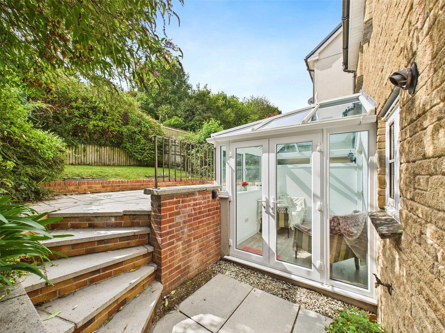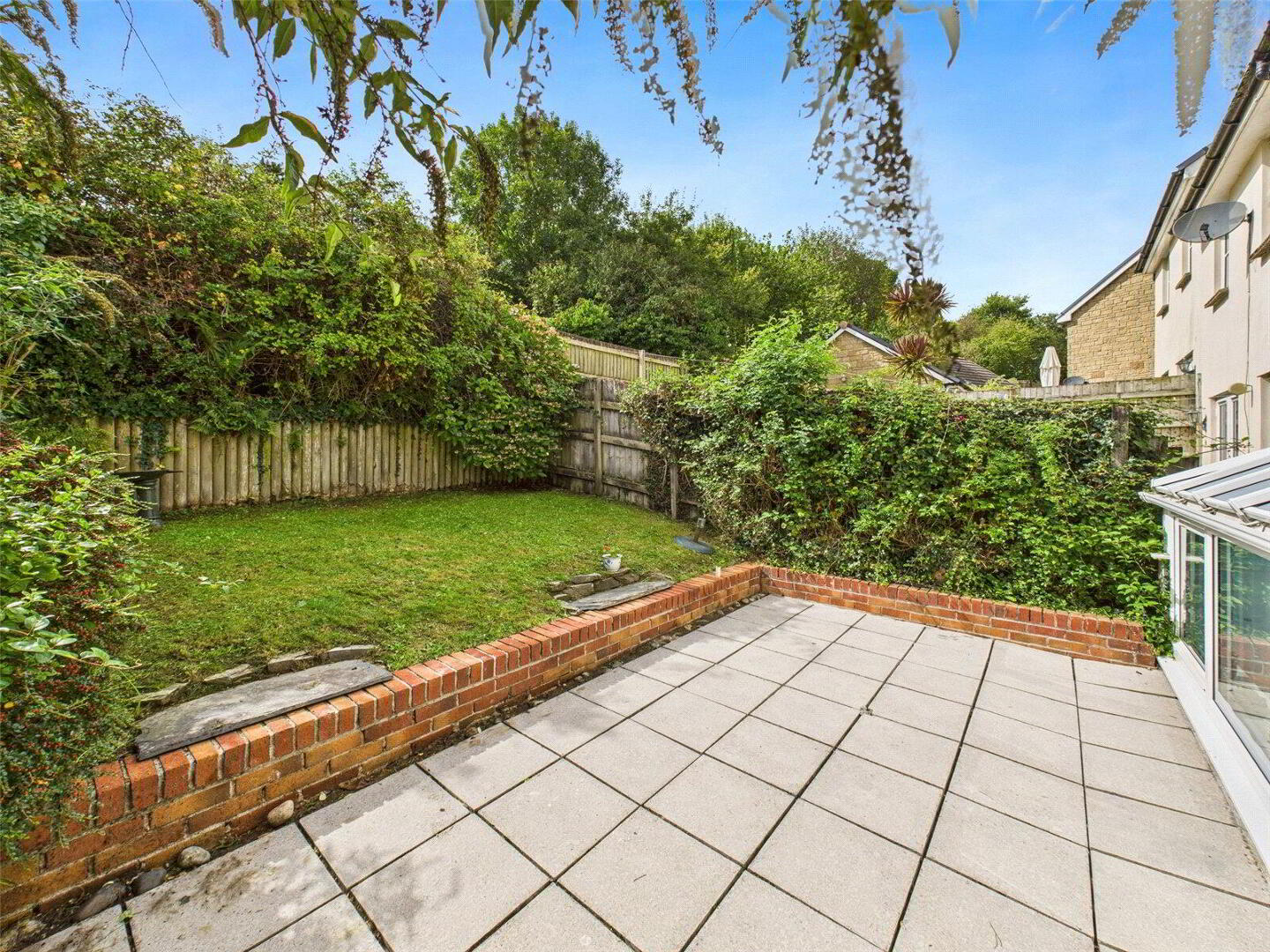 Externally, the home enjoys a low-maintenance frontage, with steps leading up to a patio area and the front door. The path wraps around the side of the property, offering access to the rear garden. The rear garden itself is tiered and south-facing, benefitting from sunlight from morning through to evening. There is a paved patio for dining and entertaining, along with a lawned area ideal for children, pets, or simply relaxing.