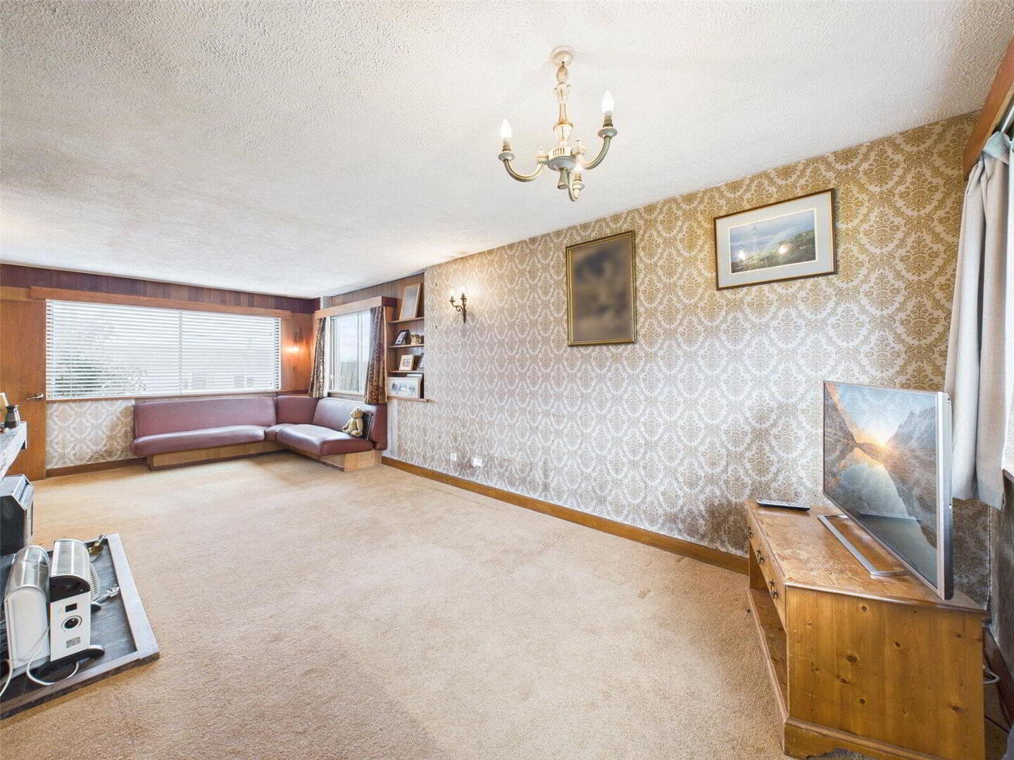 • Light-filled triple aspect living room with stone fireplace, open kitchen access and town view