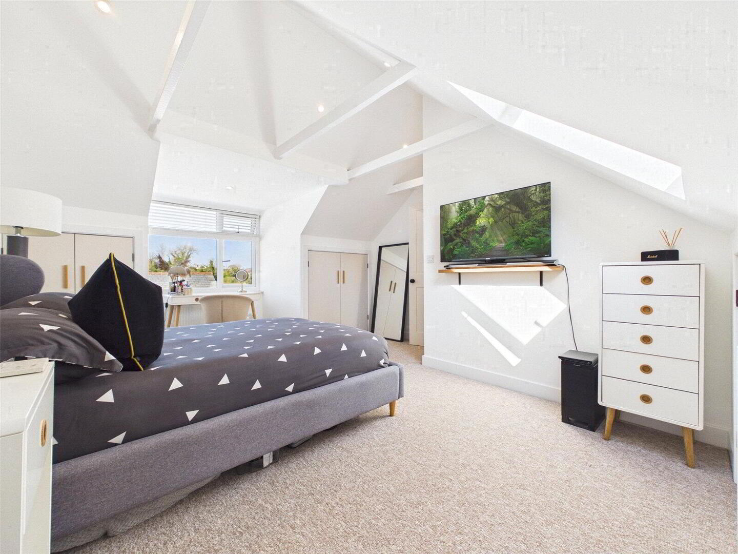 The loft conversion presents a spectacular master bedroom with built-in storage, vaulted ceilings with exposed beams, and carefully positioned LED downlighters. A dormer window captures the morning sun, while a Velux window allows for evening light. The room is bright and airy, showcasing views over Wadebridge, and provides a luxurious, contemporary master suite.