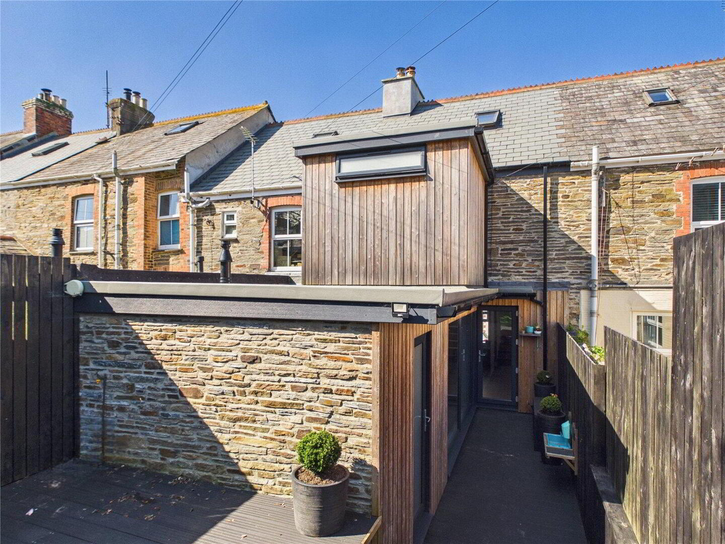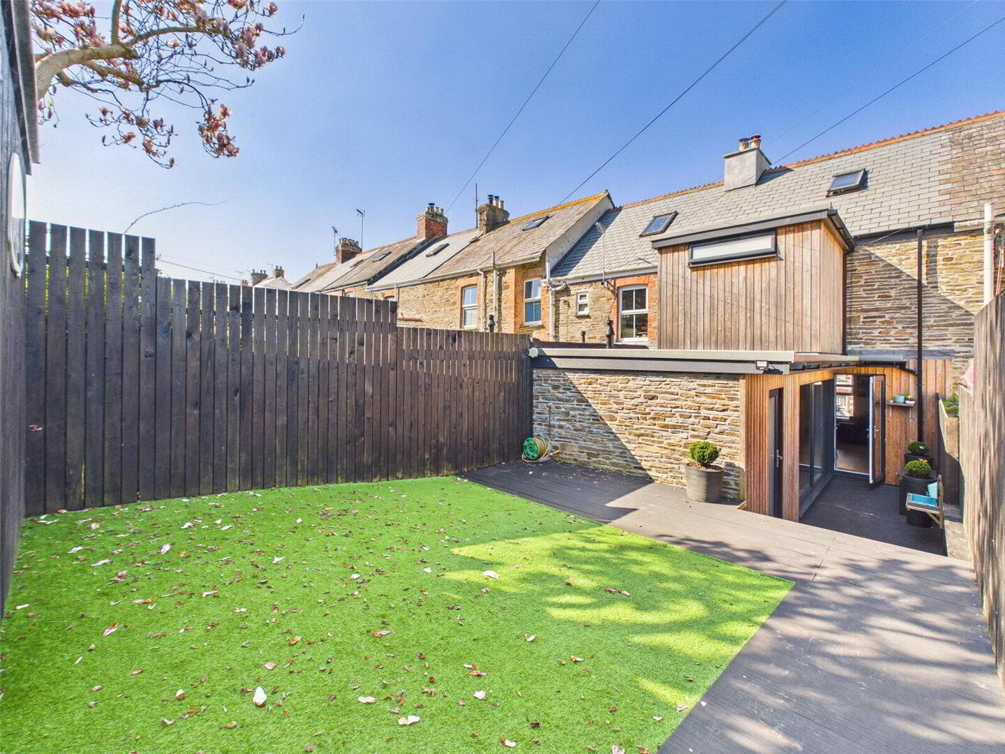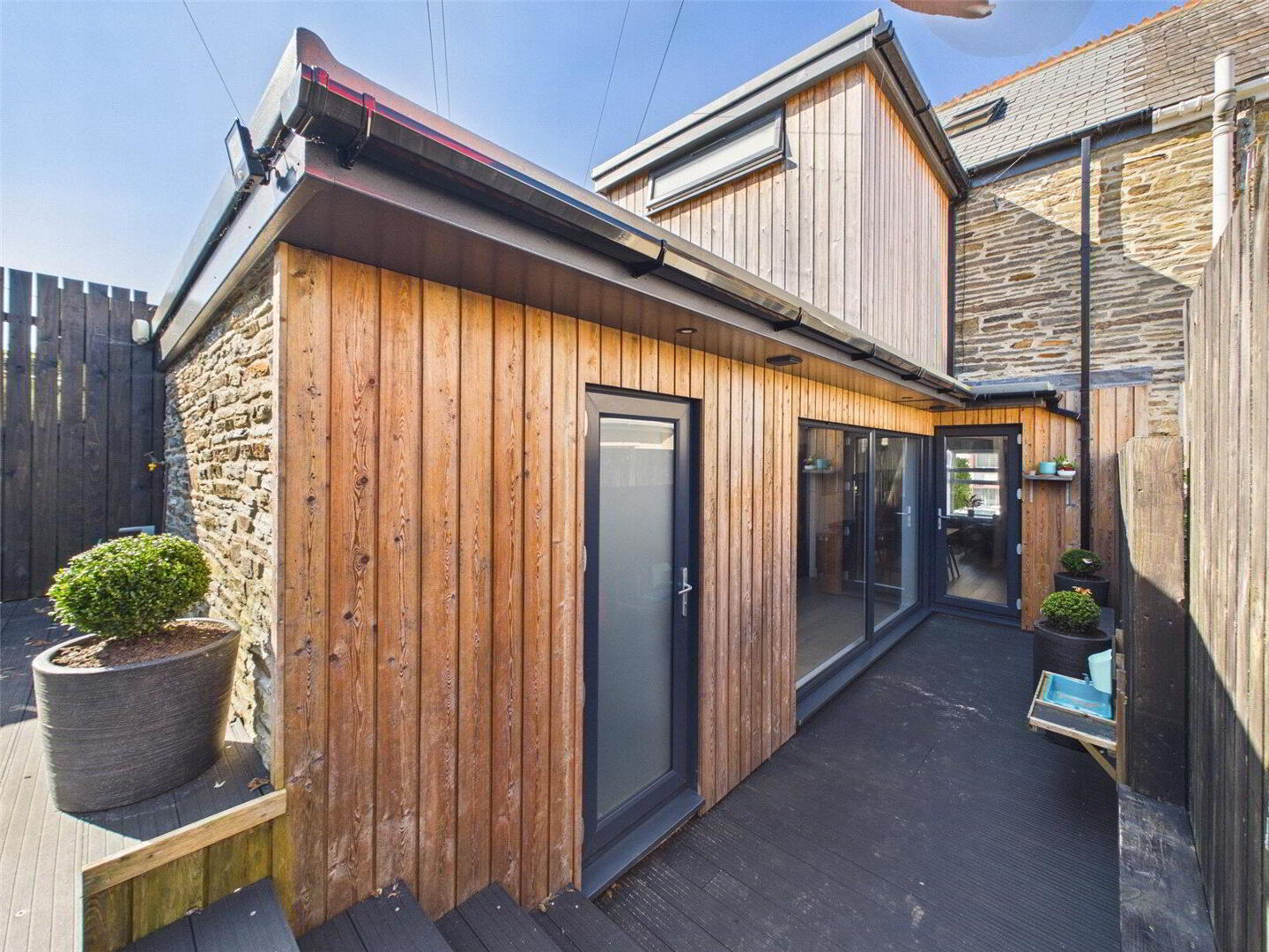 Externally, the property includes a low-maintenance garden. At the rear, a private composite decking area sits alongside the kitchen extension, with stairs leading to the astro-turfed garden, complete with a garden shed. The extensions have been finished in cedar cladding, adding character and presence, while the exposed stonework of the original building has been re-pointed to stand out beautifully.