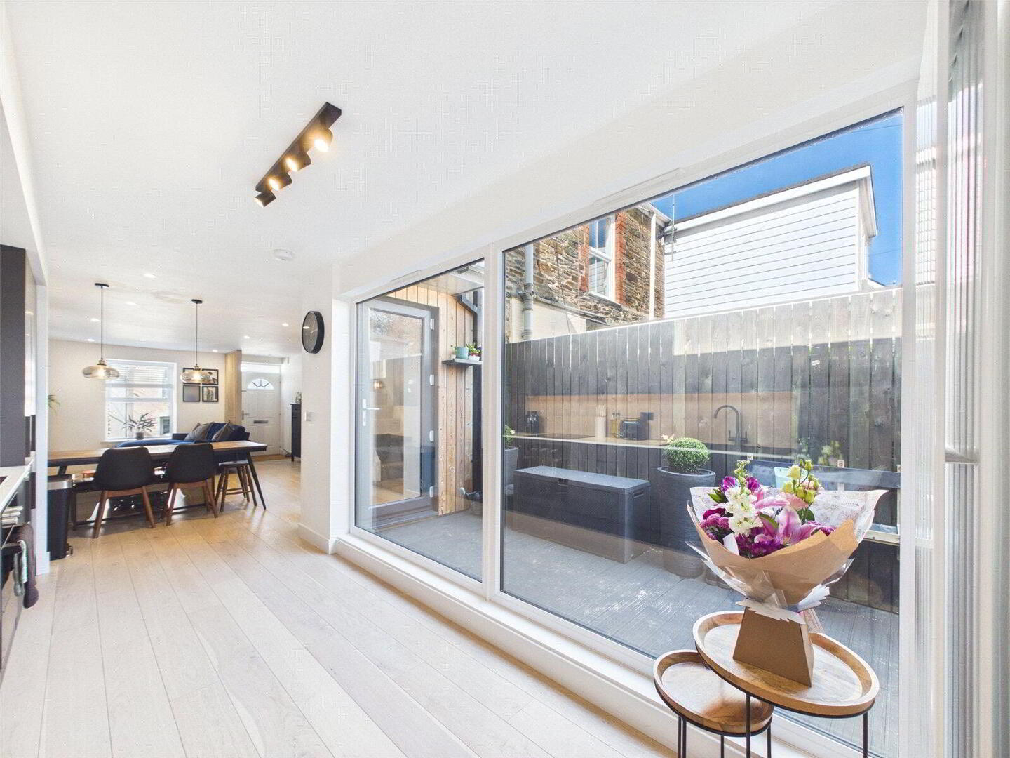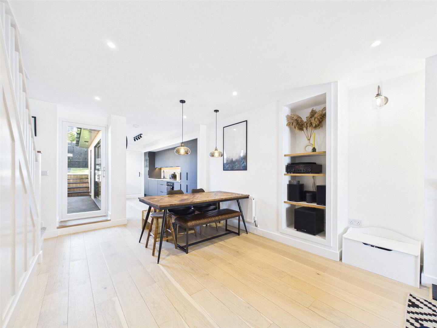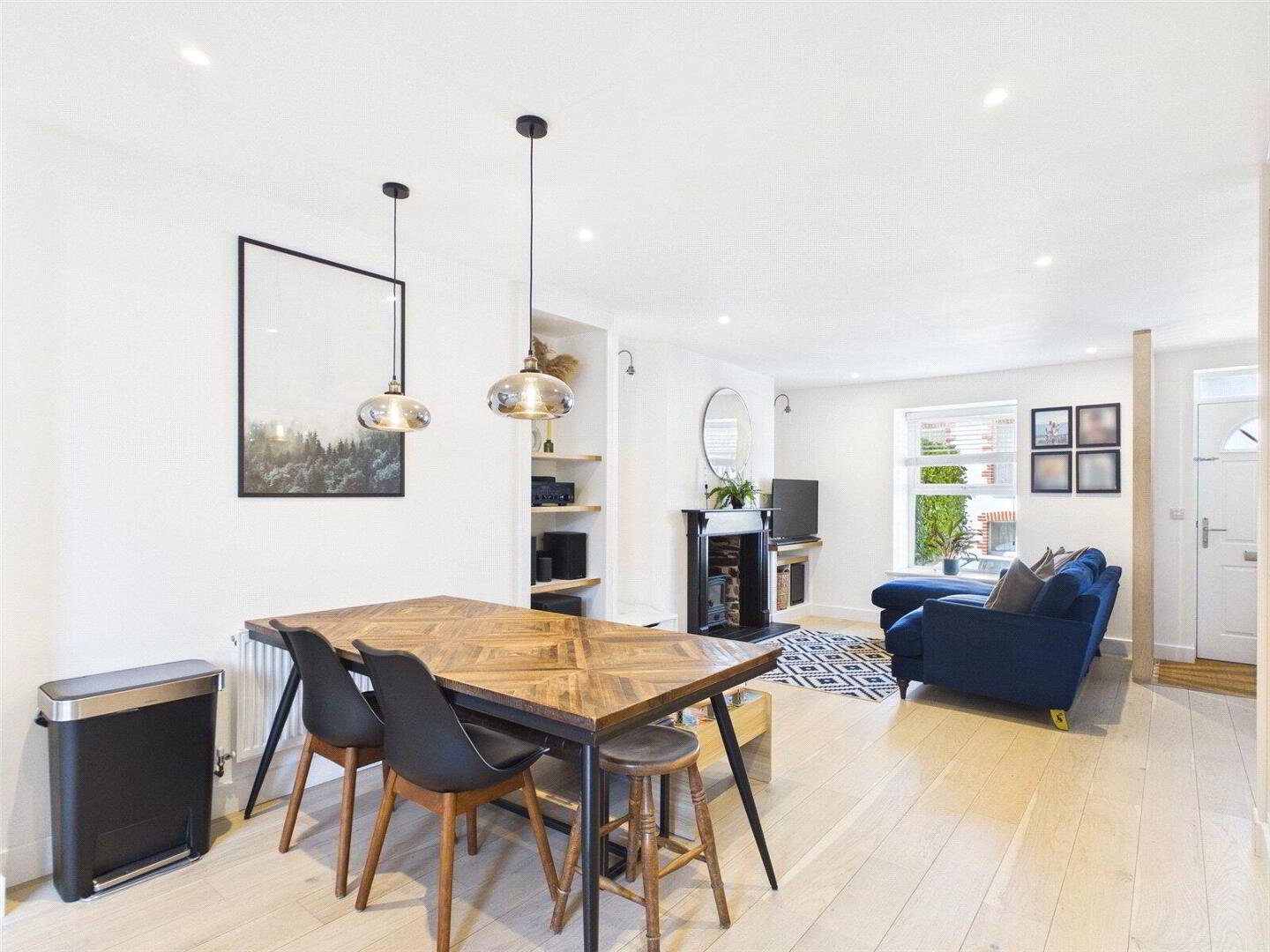 The star of this space is the elegant kitchen extension. Large floor-to-ceiling windows flood the room with natural light, highlighting the modern kitchen which boasts contemporary appliances, ample cupboard and worktop space, and a sleek design. A handy W.C. sits off the back of the kitchen, and easy access to the rear decking and garden encourages outdoor dining and entertaining. The entire ground floor is finished with stylish hardwood flooring, and the mix of LED downlighting, feature drop lights, and wall-mounted lighting ensures a high-spec, contemporary feel throughout.