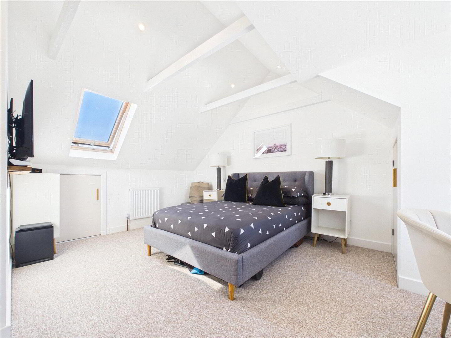 • Loft conversion master bedroom with vaulted ceilings, exposed beams, dormer and Velux windows