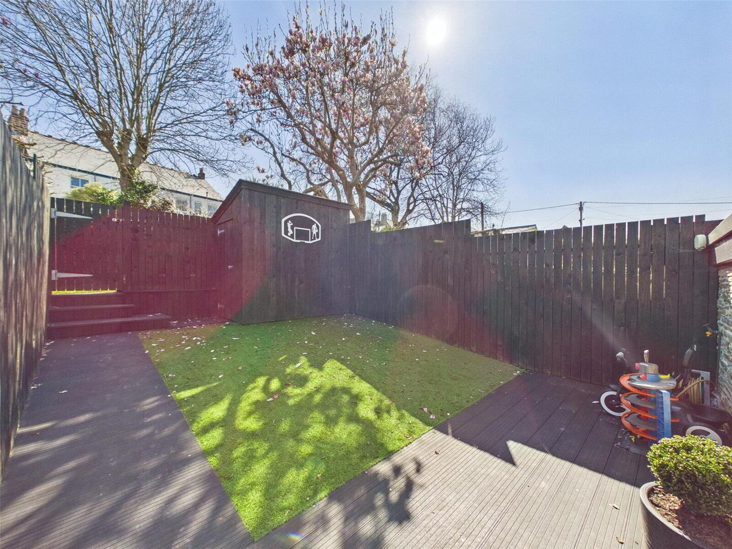 • Low-maintenance rear garden with composite decking, astro-turf, and garden shed