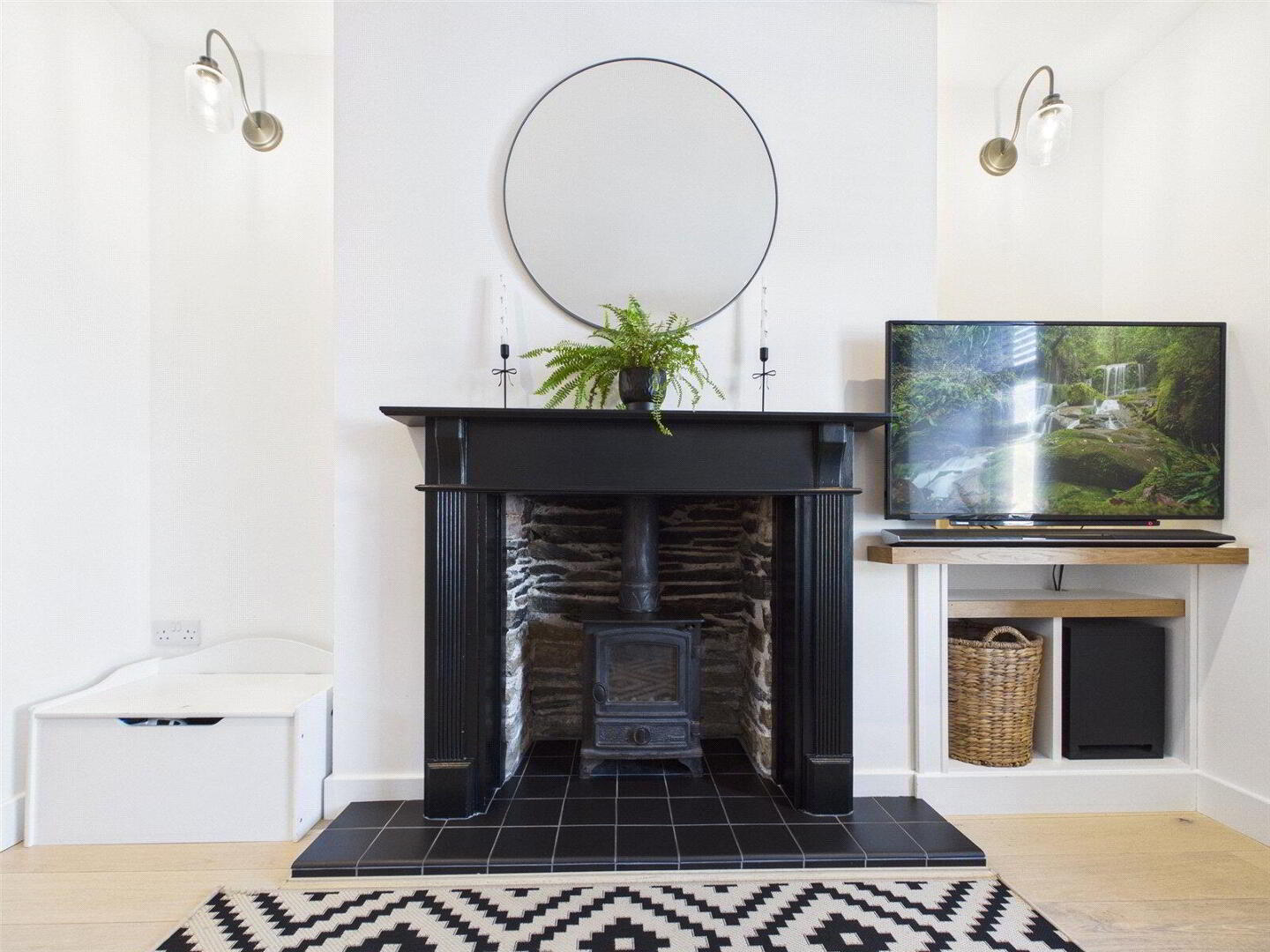 • Living space with wood burning stove set in a stone fireplace
