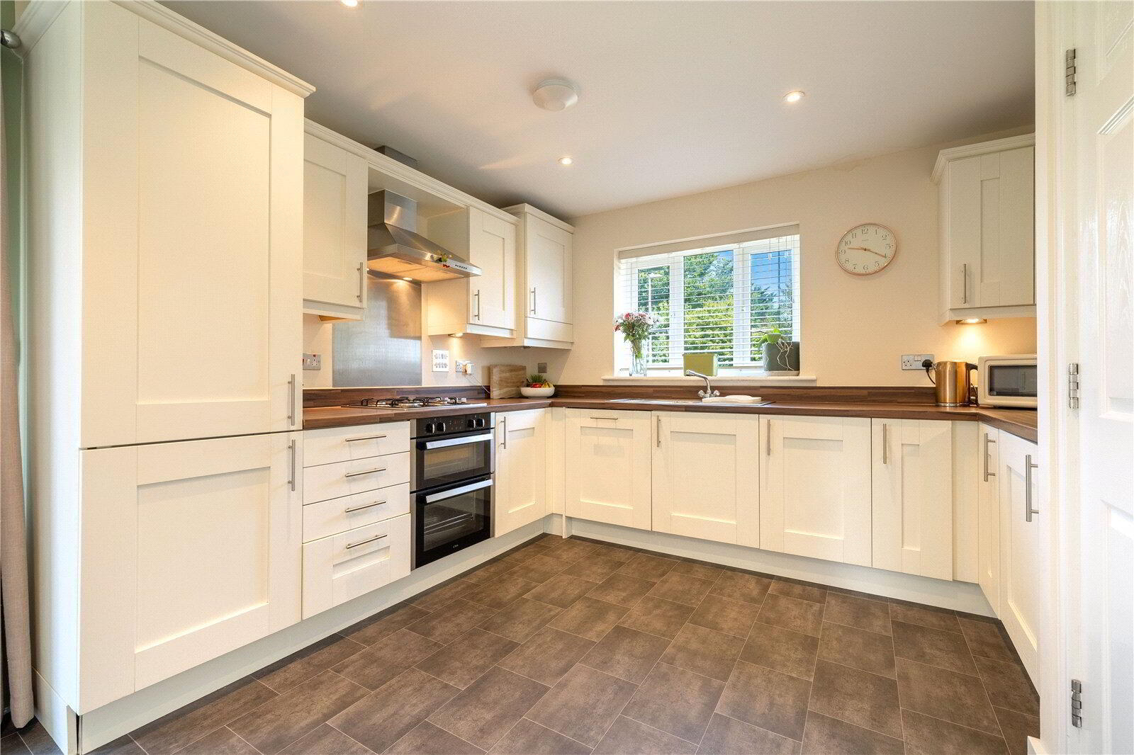The ground floor accommodation opens into a central Entrance Hall with a Cloakroom and access to both the front-facing Lounge and the stylish, open-plan Kitchen / Family Room at the rear. The Lounge provides a bright and comfortable living space, while the Kitchen / Family Room is ideal for family life and entertaining, fitted with modern units and integrated appliances, and featuring double doors that open onto the rear garden.