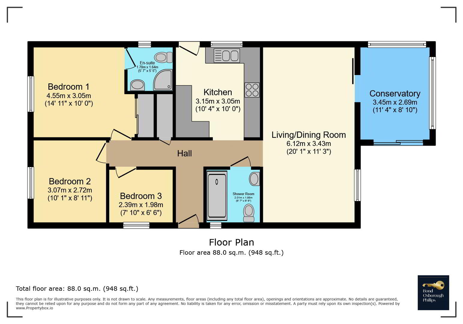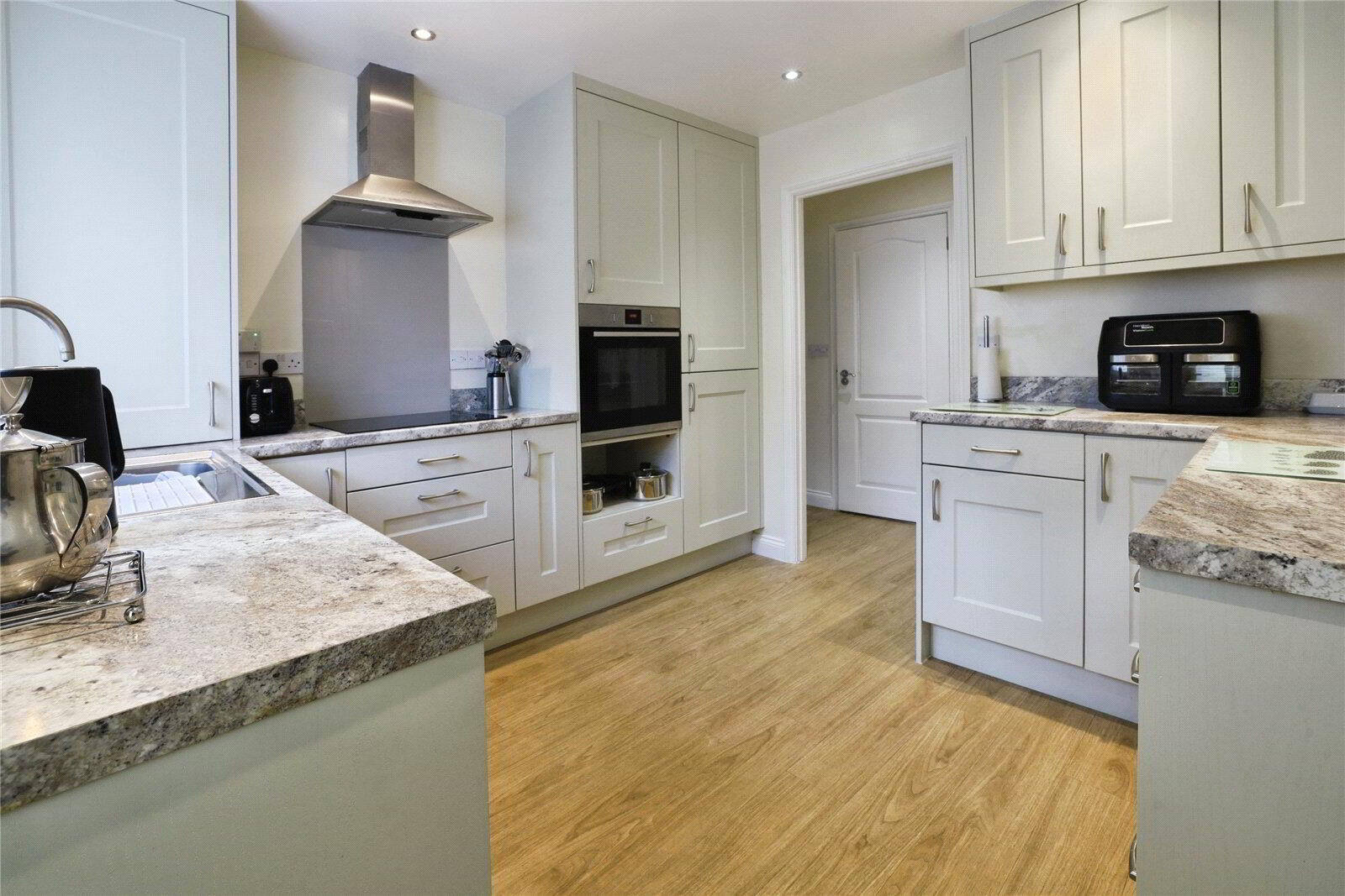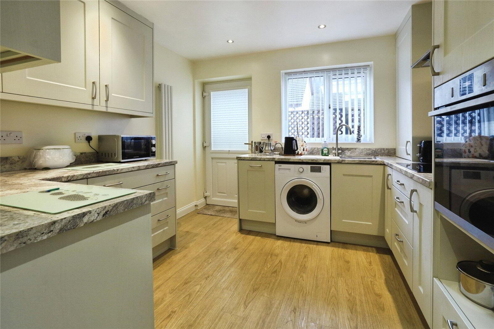 At the heart of the home is a spacious Living / Dining Room with patio doors opening into the Conservatory, where views can be enjoyed over the fully enclosed courtyard style garden, making it a perfect spot for relaxing, entertaining or simply enjoying the outlook in all seasons. The Kitchen has been newly fitted and features a modern range of base and wall units, a built-in electric hob with extractor, an integrated fridge / freezer and dishwasher, space and plumbing for a washing machine, and a side door providing useful external access.