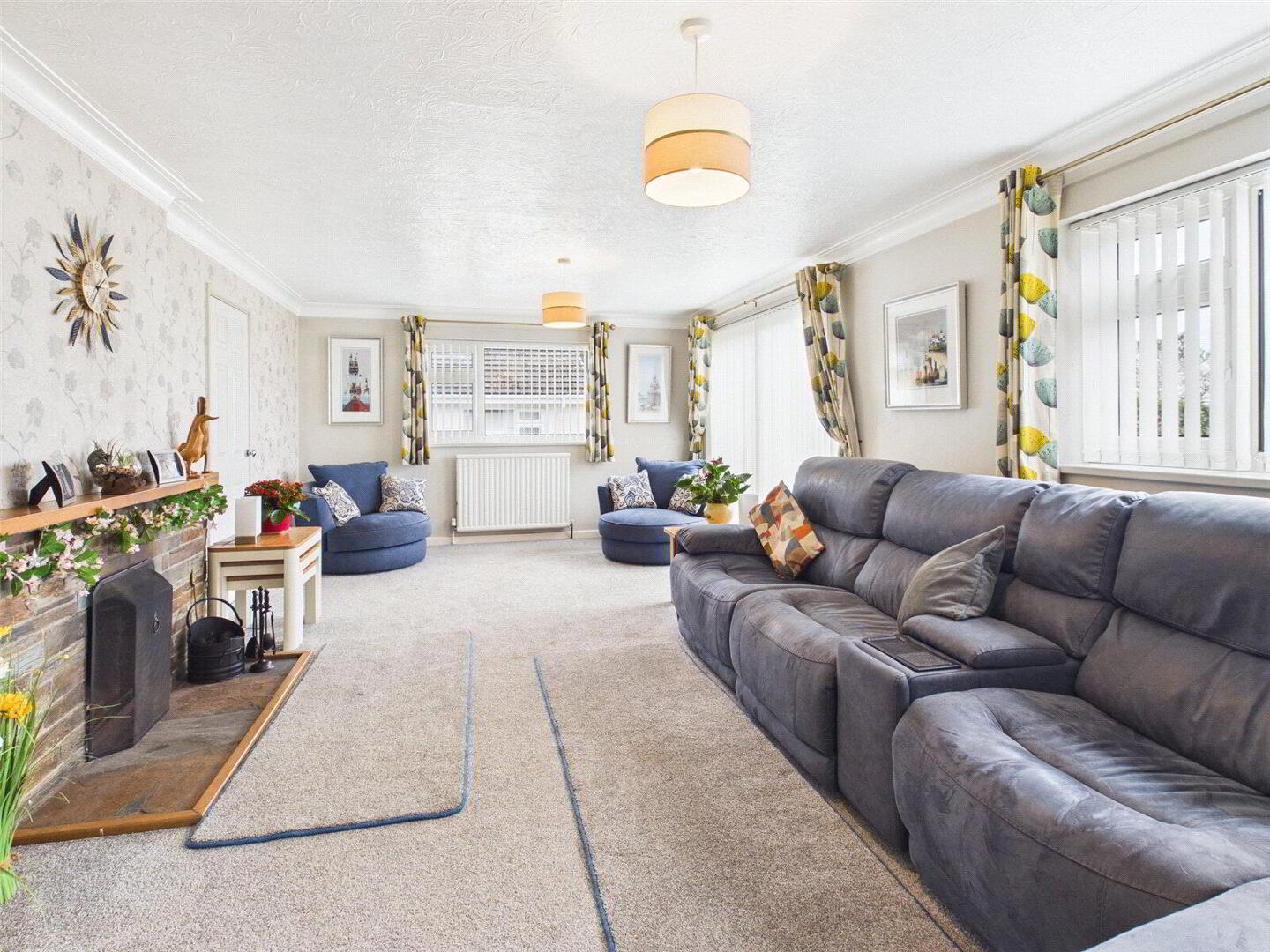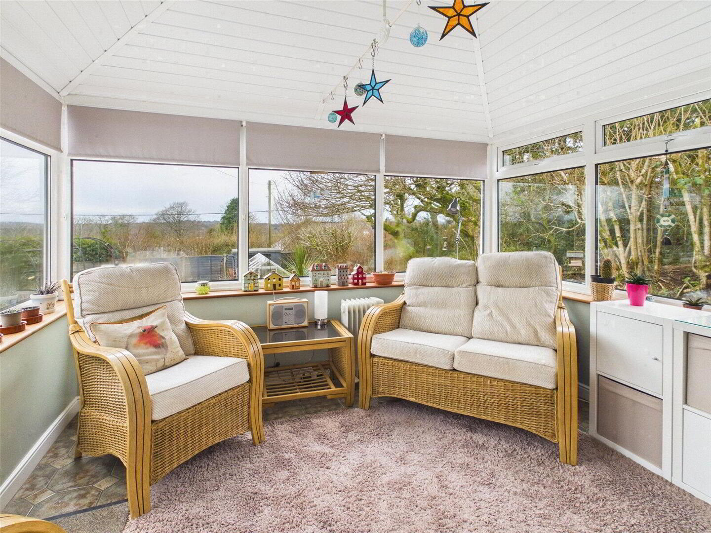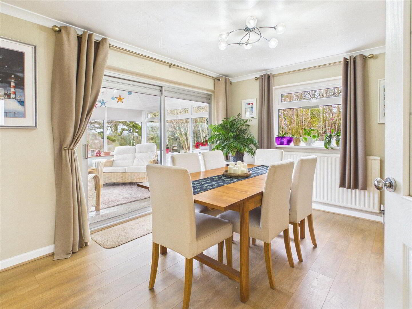 Internally, a spacious and welcoming hallway gives access to the principal living areas, including a generous sitting room featuring an open fireplace and patio doors opening onto a garden terrace, perfectly positioned to take advantage of the outlook and afternoon sun. There is a separate dining room and a delightful garden room/conservatory, now enhanced with an insulated roof to provide year-round comfort, all enjoying views over the landscaped gardens and beyond.