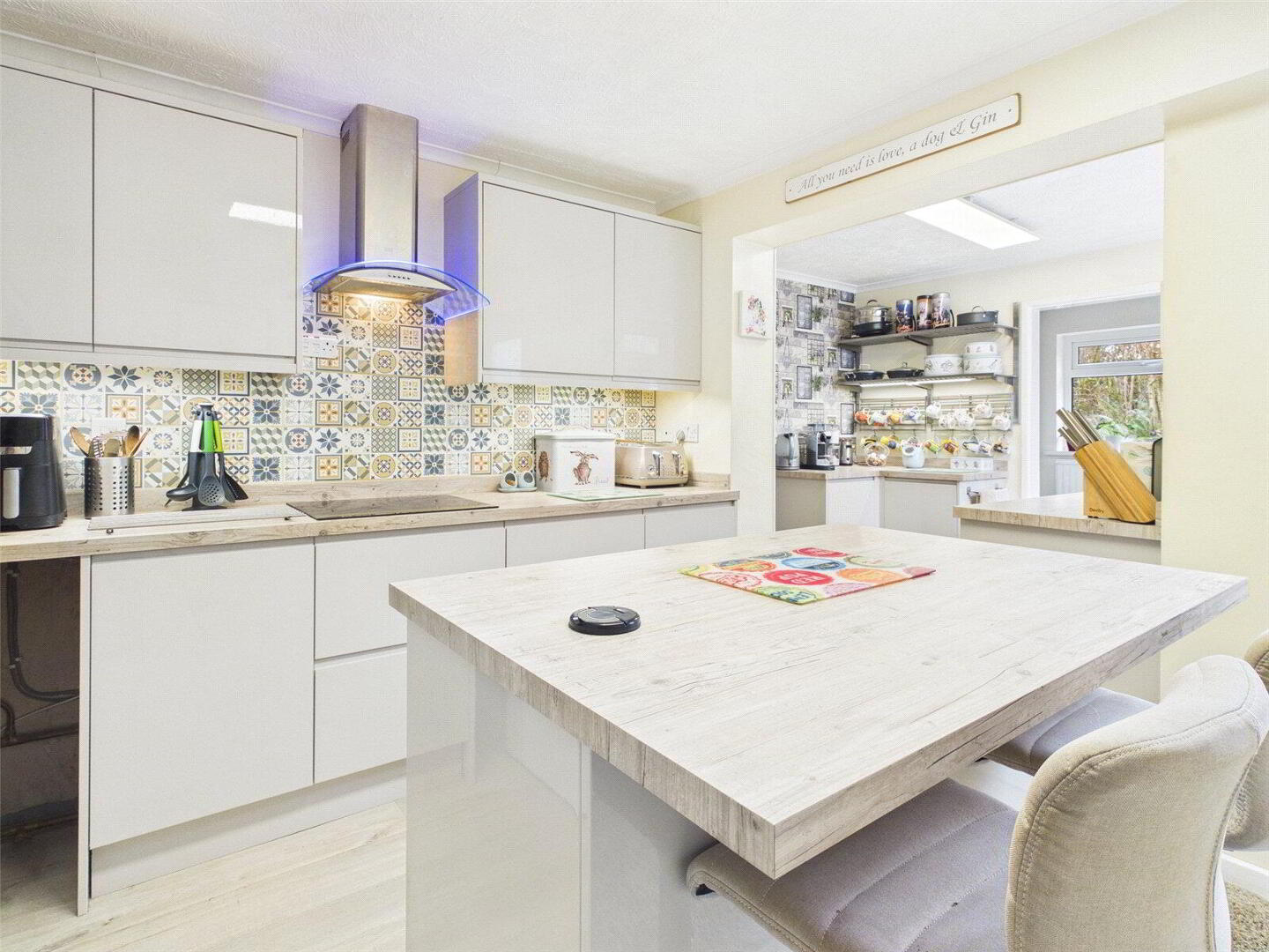 The modern kitchen/breakfast room has been refurbished to a high standard, fitted with contemporary high-gloss units beneath square-edge worktops, integrated appliances, a double oven, and an attractive central island incorporating a pull-up power and charging tower. A useful utility room adjoins the kitchen, offering space for an American-style fridge freezer, washing machine, and tumble dryer, with a door leading out to a sheltered rear courtyard from the kitchen.