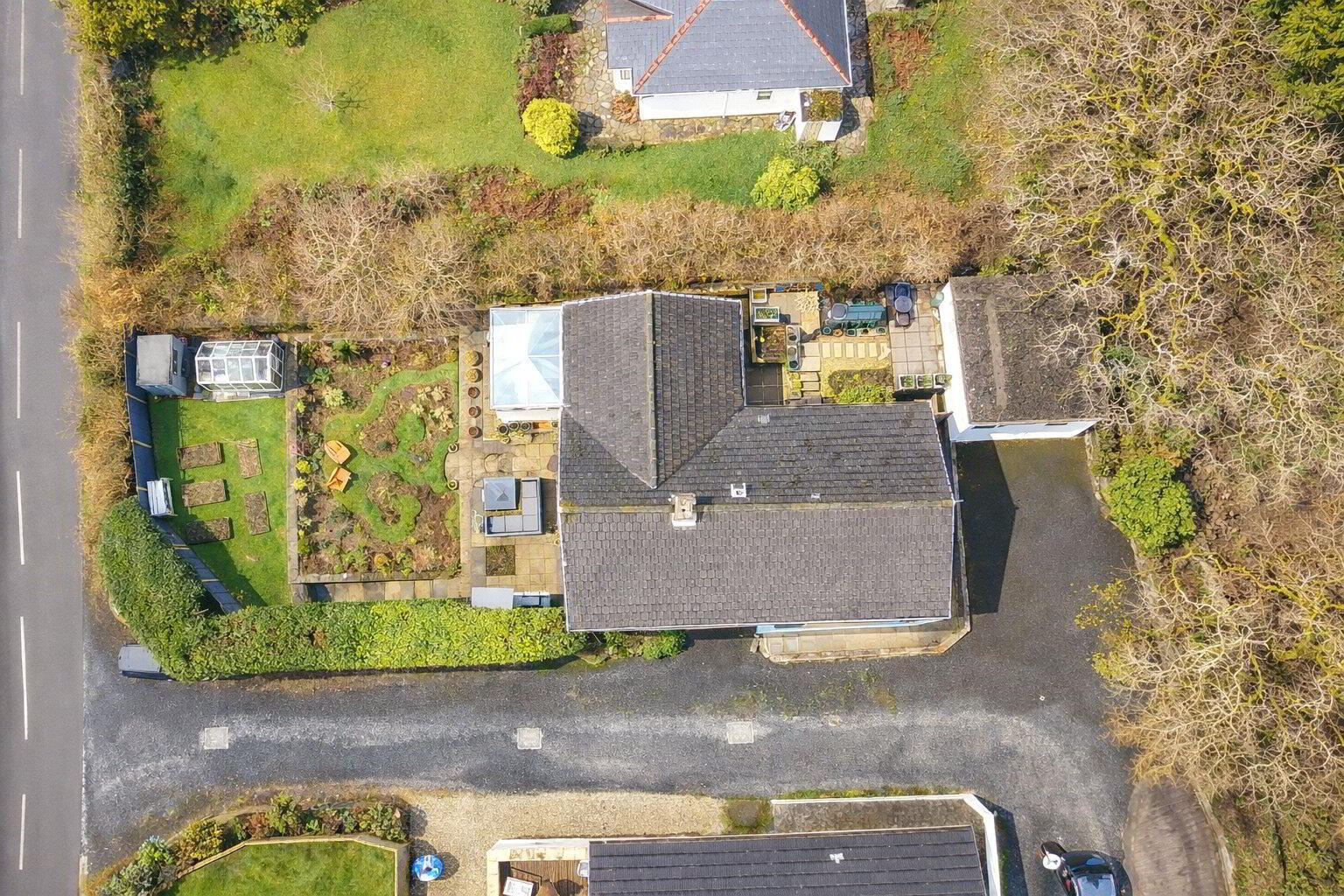 The bungalow, originally built in the 1970s and thoughtfully extended shortly thereafter, provides generous and versatile accommodation throughout. It is approached via a sloping tarmac driveway leading to a large parking area and a larger-than-average detached double garage, complete with electric up-and-over door. There is ample off-road parking for multiple vehicles.