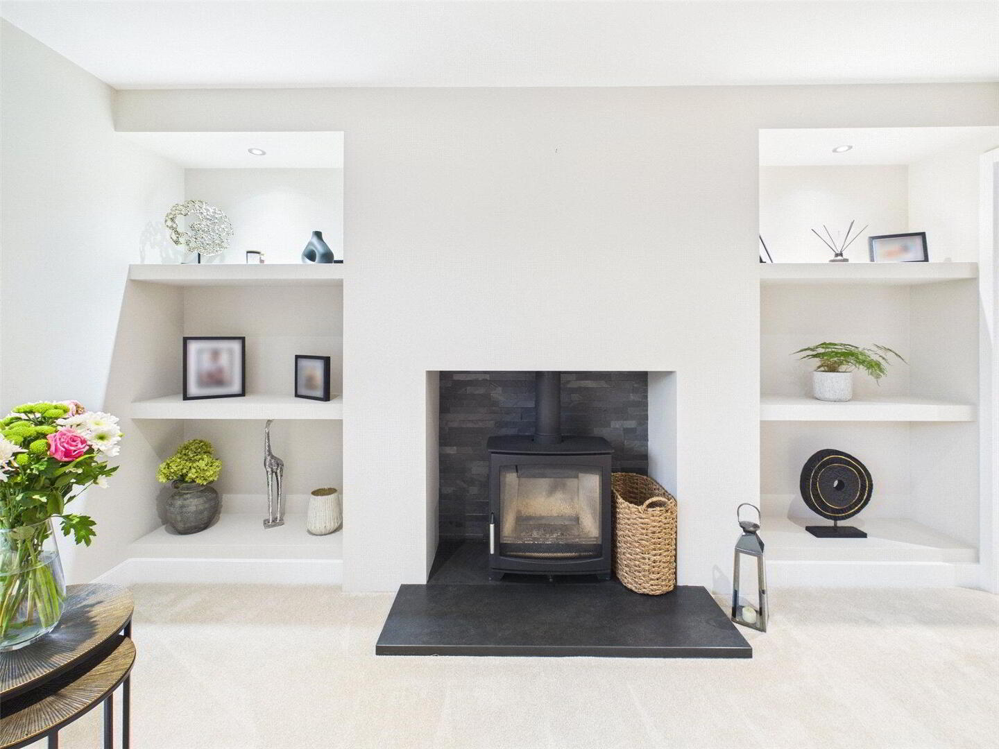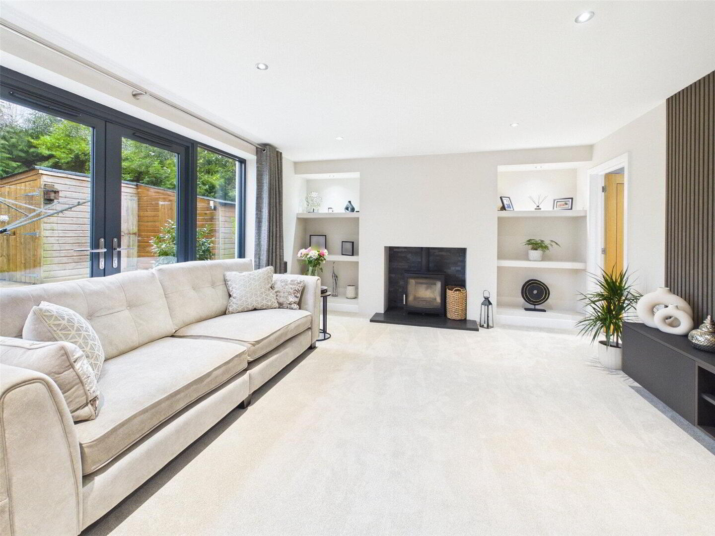 The living room offers a more intimate yet equally impressive setting, with double doors opening onto the front garden and a wood-burning stove providing warmth and character. From here, a discreet door leads through to a sleek and stylish home office, ideal for those working remotely or seeking a quiet retreat.