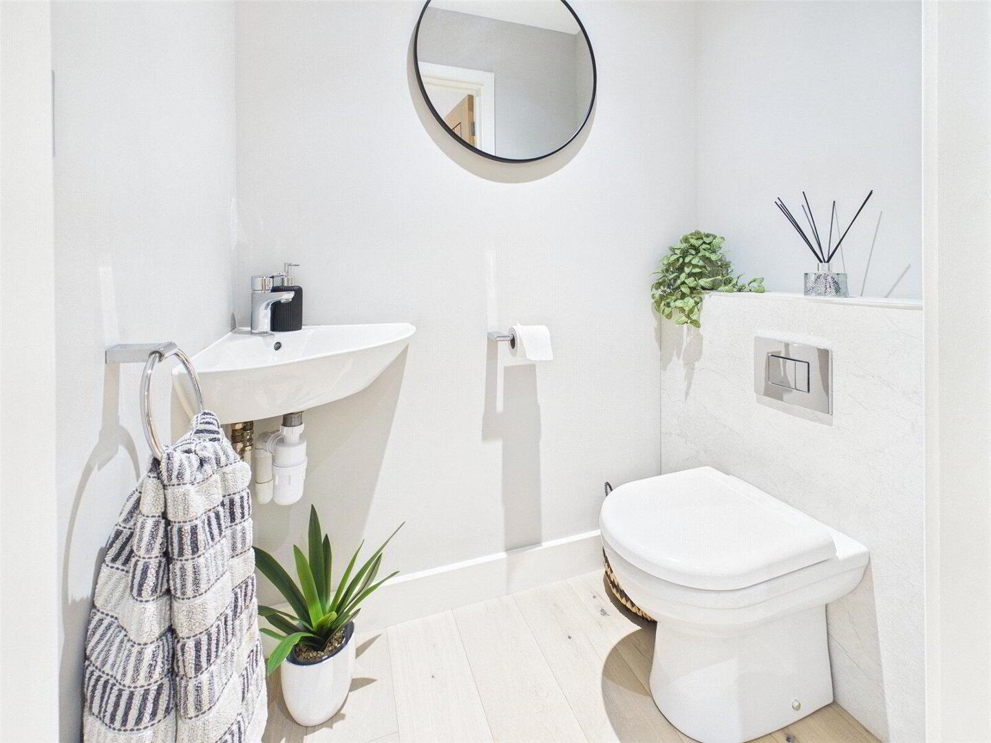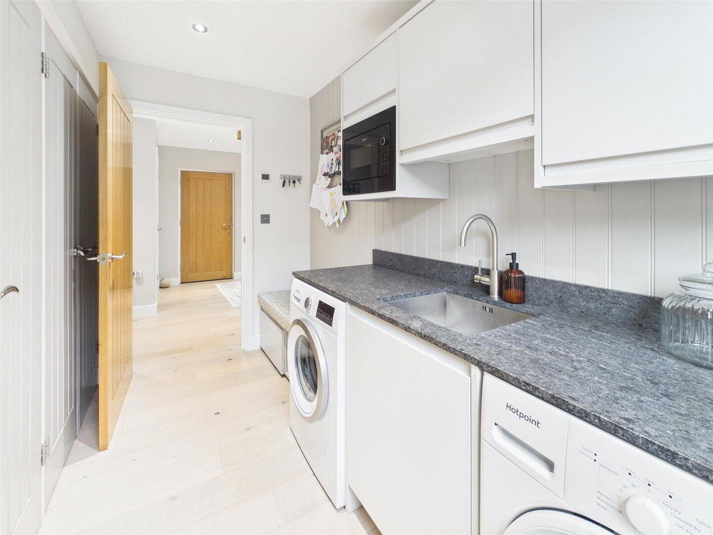 Practicality has been carefully considered, with a well-appointed utility room offering excellent storage alongside a built-in microwave, complemented by a contemporary cloakroom on the ground floor. A striking glass balustrade staircase rises to the first floor, adding a further sense of architectural interest and refinement.